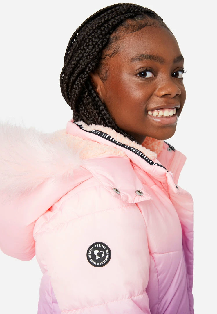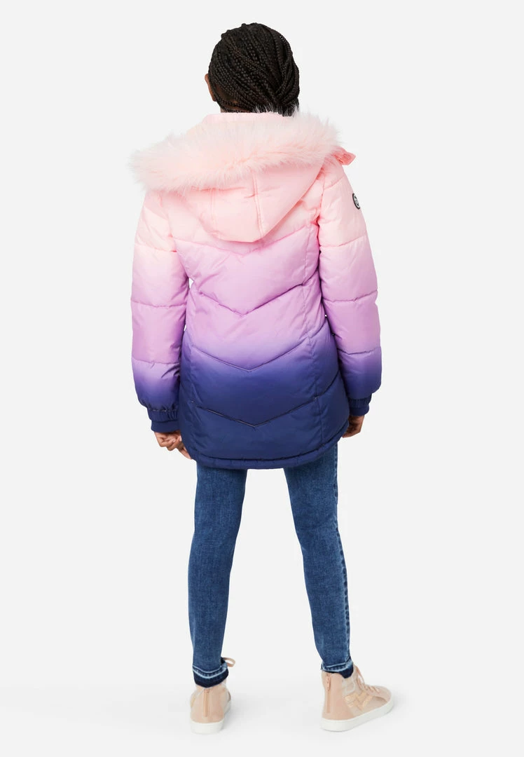 Our girl’s zip-up coat features a combination of anorak and puffer designs. Chevron quilting gives it a classic, allover texture. The detachable hood has storm flaps that snap and has a soft faux fur trim that shields her on windy days. The high collar has sporty logo taping—complete with a positive message. Plus, it’s lined with cozy faux sherpa and has a chin guard. A patch punctuates one of the arms. Ribbed storm cuffs keep cool air at bay. And two slanted slit pockets are perfect for tucking small items away.