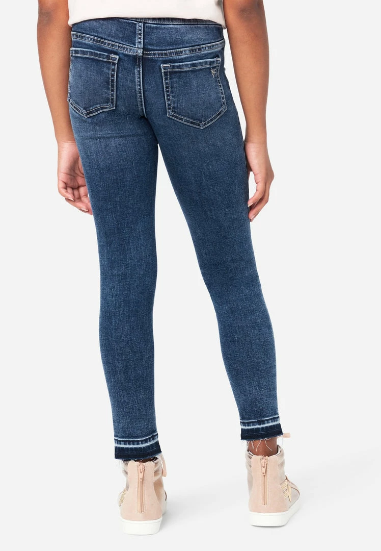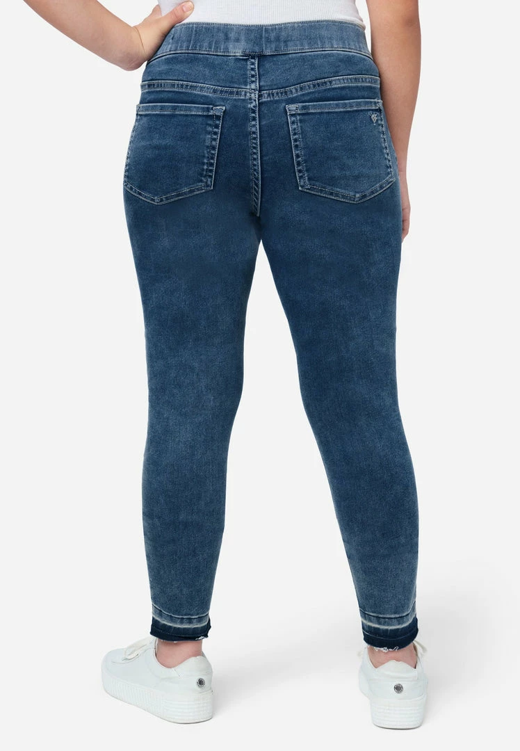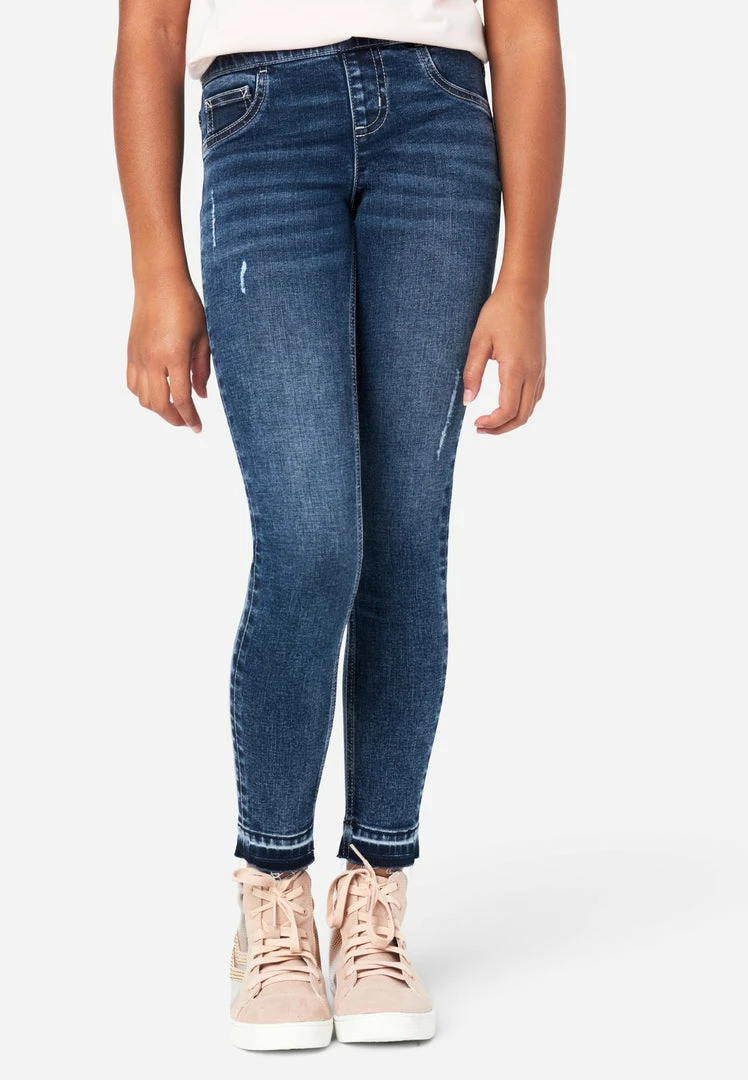 Our woven girls’ jean leggings have a stretchy, contour pull-on waistband—that keeps up with all her movement. Rise in the back prevents gapping. Destructed details with backing promise modesty with edge. The legging-like fit and mid-rise offer classic style. The deconstructed hems bring on-trend flair. And welted seams make them super-durable. They’re perfect for pairing with her favorite tees and sweatshirts. Plus, the comfy, stretch-cotton fabric is made with Repreve® denim—which is created using recycled materials. This means not only will your girl look good while wearing her fashion, but she’ll feel good about her fashion, too.