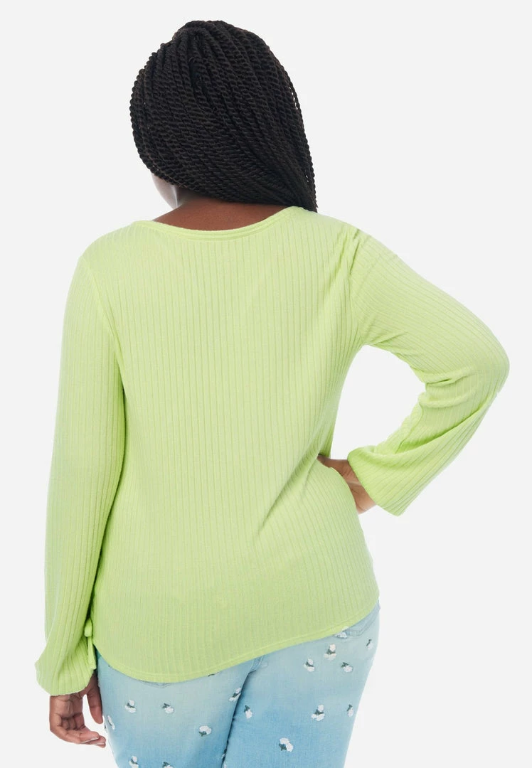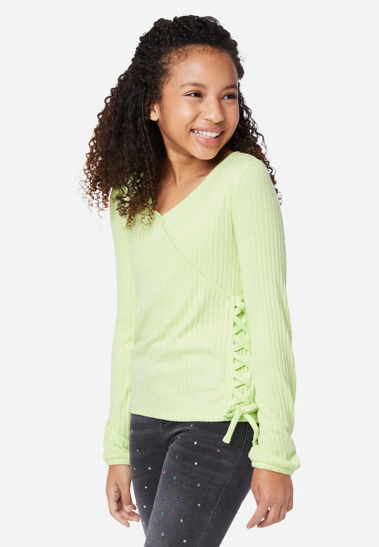 Meet her new favorite, our girls’ ribbed knit top which is crafted from soft stretch-fabric and recycled materials. This means not only will your girl look good while wearing her fashion, but she’ll feel good about her fashion, too. It’s V-neckline, that falls into a wrap-effect with a sweet side lace-up, ups the ante on her everyday style. In addition, its comfortable elastic cuffs give a slight balloon effect to its long sleeves. The easy-to-pair-hues are perfect for mixing and matching with Justice leggings or jeans from our Denim Shop.