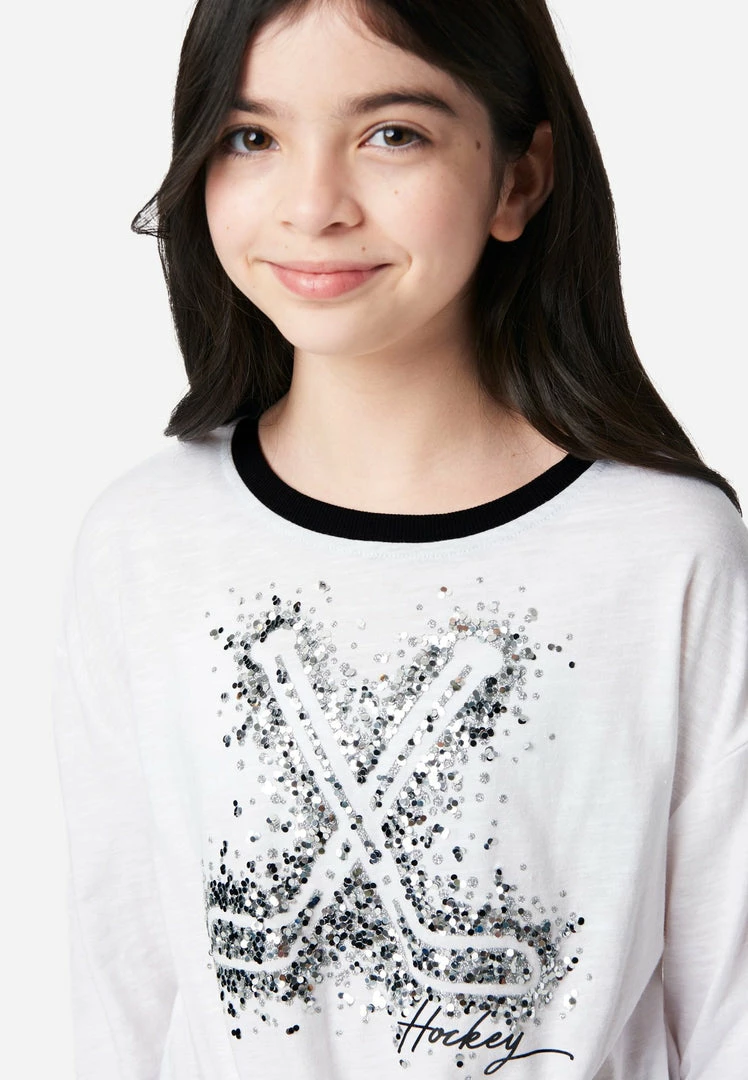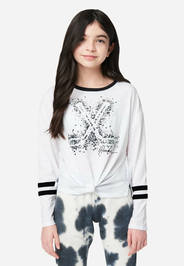 Your all-star will love our girls’ tees that feature a glittering sequin sports graphic. The contrast neckline is an ode to the ringer style. Side vents, stripes on the sleeves, and a tie at the front hemline ups the athletic appeal. Plus, she can rep her sport by pairing her tee with a matching hoodie and joggers.