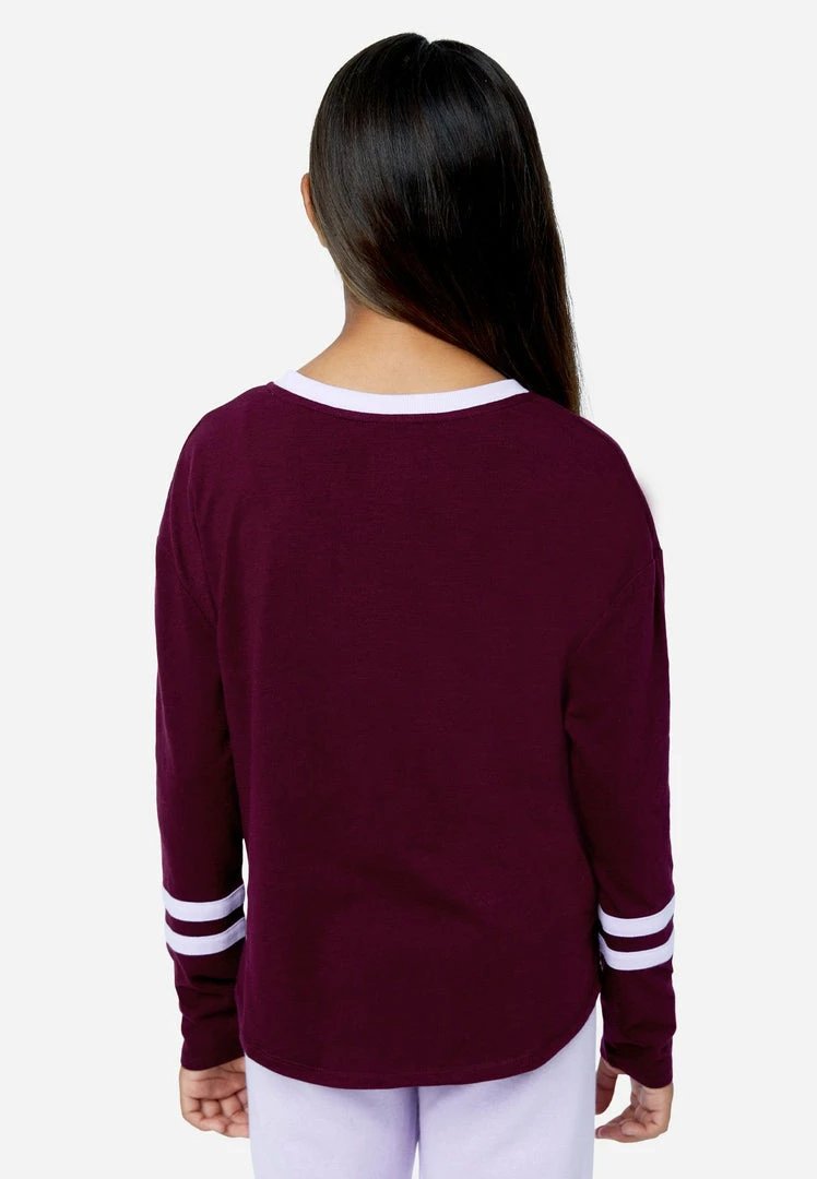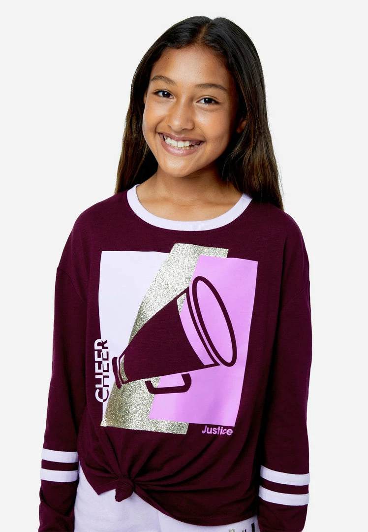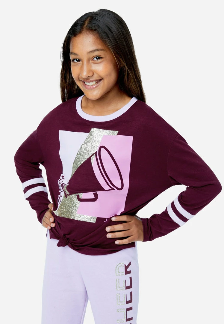 Your all-star will love our girls’ tees that feature bold sports graphics on the front. Bias binding finishes the neckline. Color-block sports stripes highlight the long sleeves. The hemline has side vents which promise range of movement when she’s active. The hemline is also tied to add subtle dimension and visual interest to outfits—even when untucked. They’re designed in soft cotton-blend that promises the comfiest wear, ever. She can rep her sport by pairing her tee with a matching hoodie and joggers. Plus, they’re made with recycled materials. This means not only will your girl look good while wearing her fashion, but she’ll feel good about her fashion, too.