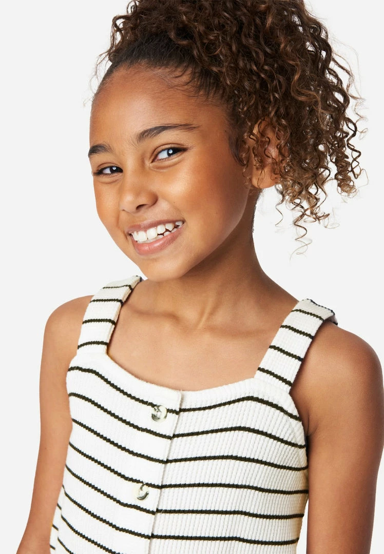 A square neckline and horizontal stripes offer classic style to our girls’ tanks. Marble-inspired buttons add natural texture to the front. The pure-cotton fabric promises daylong comfort. A tie punctuates the front hemline. And ribbing brings playful texture.Â