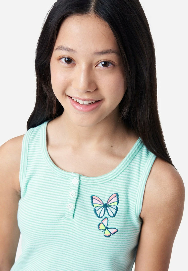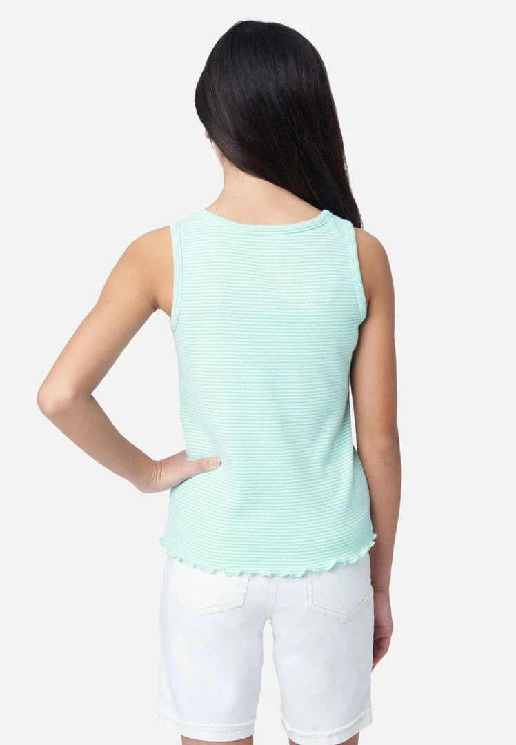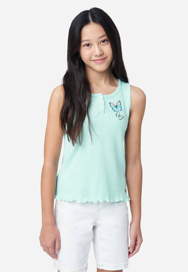 Our girls’ tank is the perfect mix of casual and comfort thanks to its stretch cotton and Henley design. The scoop neckline keeps it classic. A graphic on the front highlights the striped pattern. It’s complete with a wavy lettuce hemline for an extra feminine touch. She’ll love pairing this with jeggings or jeans from our denim shop.