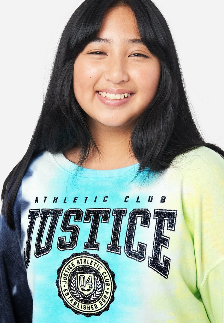 A tie-dye style that’s to-die-for. The classic crew sweatshirt style gets an old-school twist with a glittery collegiate-inspired Justice insignia emblazoned along the front. The long-sleeved style rocks a trendy tie-dye print all over, and is finished off with a raw hem that lends a vintage-inspired twist to the bold design.