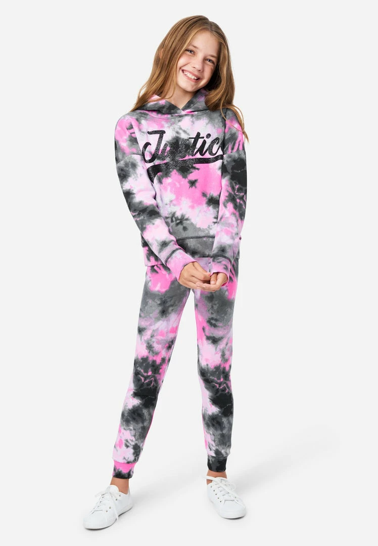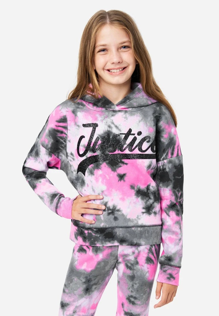 Cotton-blend fabric gives our girls’ sweatshirts a cozy finish. A tie-dye design adds a bold pop of color. A cool Justice logo highlights the front. They classic banded cuffs and hemline. The pullover design promises easy layering. Effortlessly pair them with matching joggers.