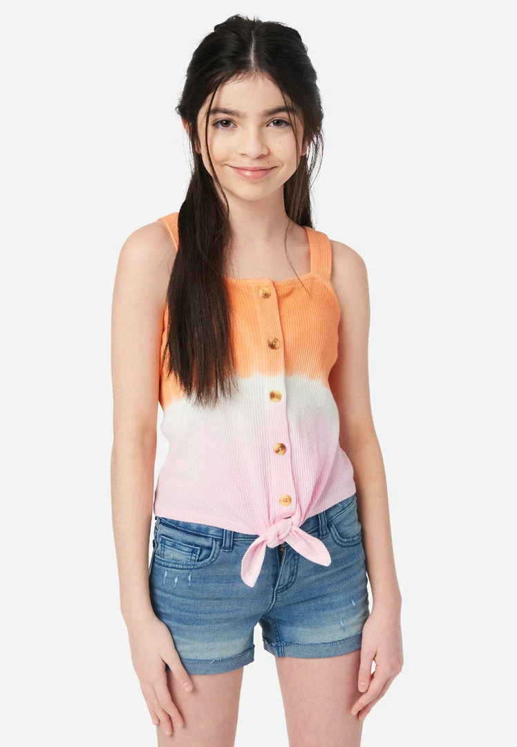 A square neckline lends classic style to our girls’ tanks. They come in easy-to-pair solid hues or with a dip-dye design. Wood-inspired buttons add natural texture to the front. The cotton fabric has a hint of stretch. A tie punctuates the front hemline. And ribbing brings playful texture. They pair perfectly with Justice Denim shorts.
