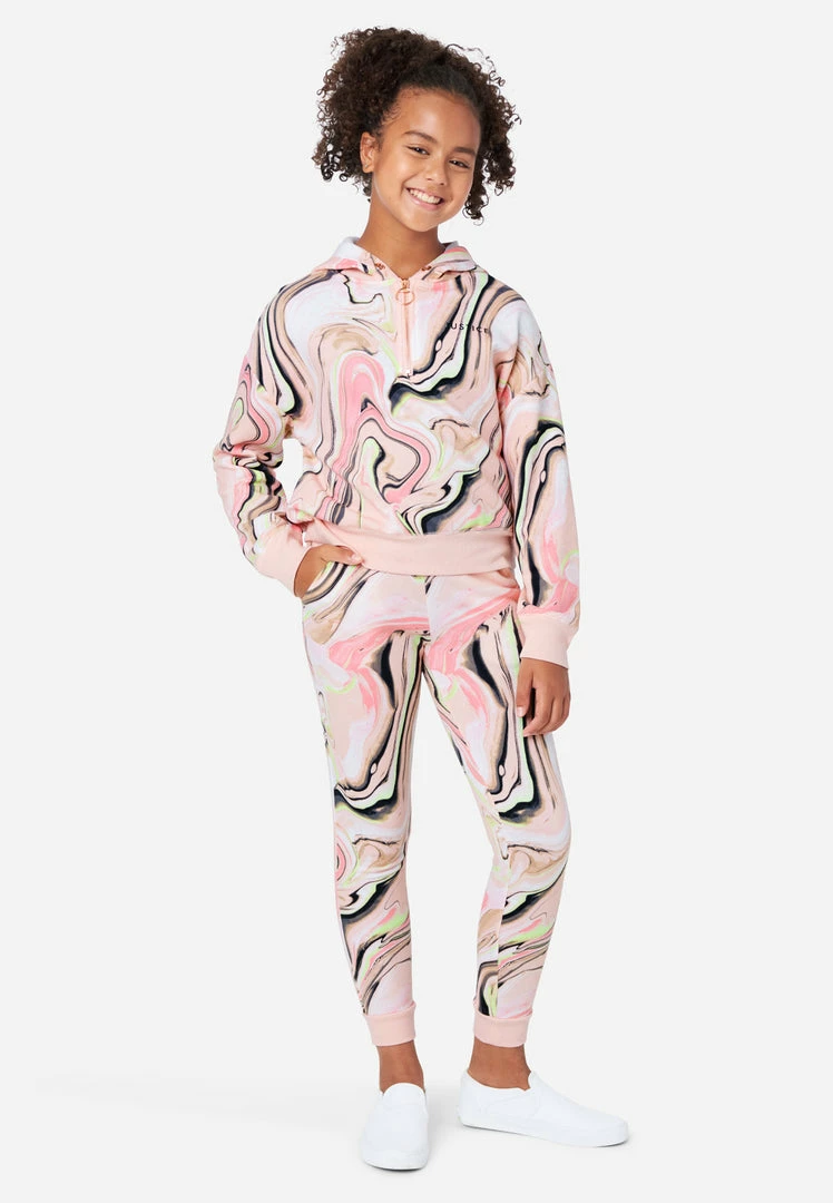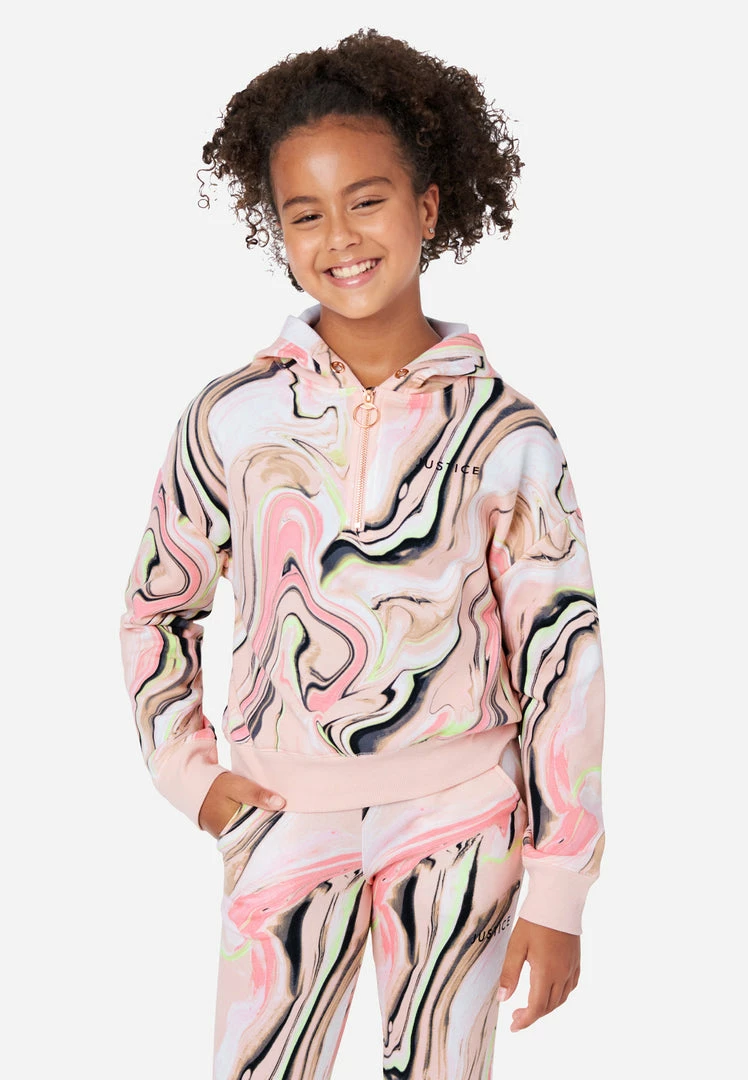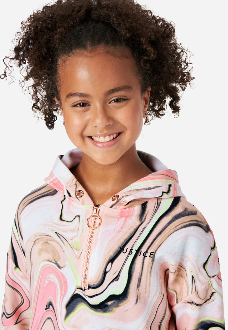 We elevated our girls’ hoodies with all the extra-special details Collection X by Justice is known for, like gold hardware that brings panache charm to the half-zip neckline and offers a hint of shine. A bold allover pattern gives them standout appeal. A Justice logo graphic adorns the front. And the banded hemline and cuffs bring classic style. Your all-star can throw on her hoodie as an extra layer of comfort to wear in the studio to the sidewalk. Plus, she can match it with joggers and other pieces in this capsule collection.