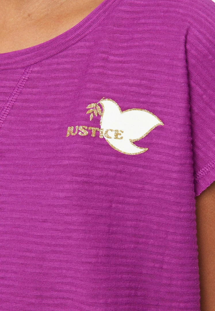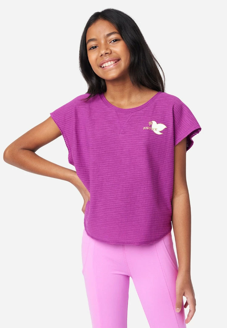 We elevated our girls’ tees with all the extra-special designs and details Collection X by Justice is known for. The cotton blend promises durability for wear after wear. Ribbing brings playful texture to the tee. Bias binding finishes the neckline. Cool graphics add an artful vibe to the front and back. The rounded hemline in the front adds structure to outfits—even when untucked. The back has cool peekaboo slits and a tie at the hemline. And the bold hues are a perfect match for shorts, leggings, and other pieces in this capsule collection.