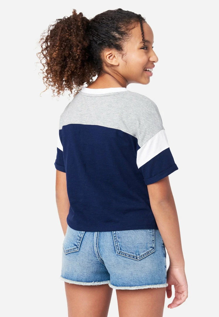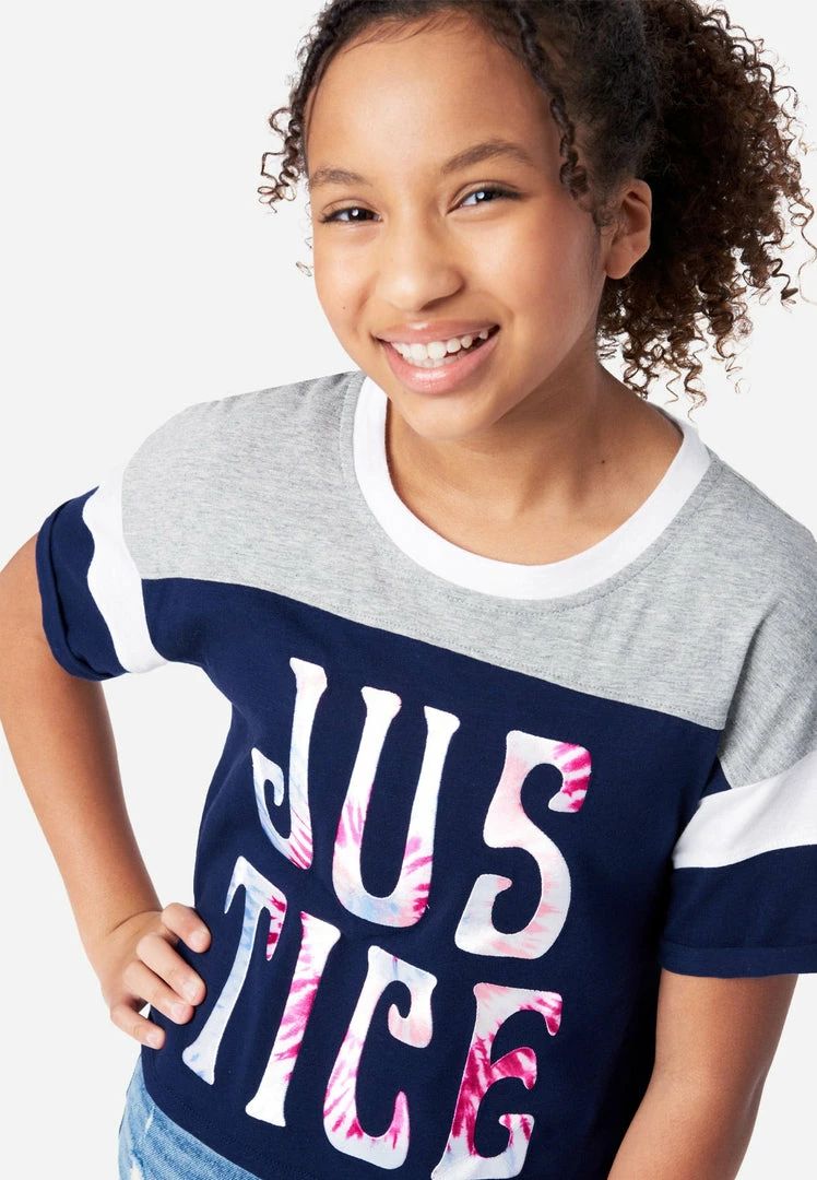 Our girls’ tees rock a color block design with an oversized Justice logo graphic on the front to make it pop. It has a 90s-inspired ringer scoop neckline and a relaxed fit. Plus, she’ll love pairing it with jean shorts from Justice denim shop.