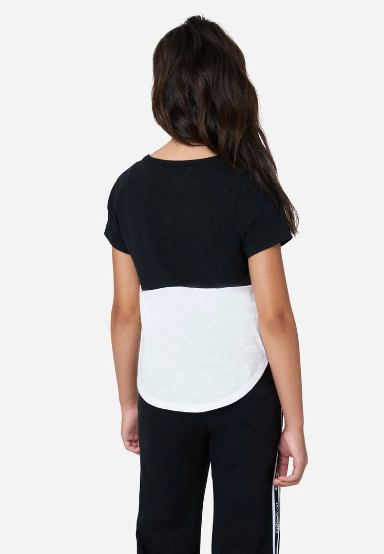 Our girls’ tees have a standout color block design. The slub-jersey cotton-blend fabric is super-soft and promises daylong comfort. A cool graphic highlights the front. The relaxed cut lends full coverage. And the rounded hemline makes sure her tees add structure to outfits—even when untucked.