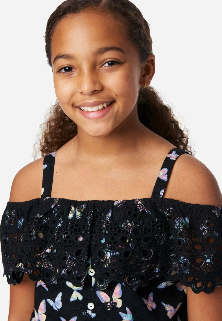 Frilly, scalloped ruffles adorned with ornate embroidery bring a pretty finish to the neckline of our girls’ tanks. The breezy, pure-cotton fabric promises comfortable wear. Sweet buttons stationed down the center have a shell-inspired finish for a hint of iridescent shine. A stretchy waistband offers a perfect fit over Justice Denim shorts and jeans.