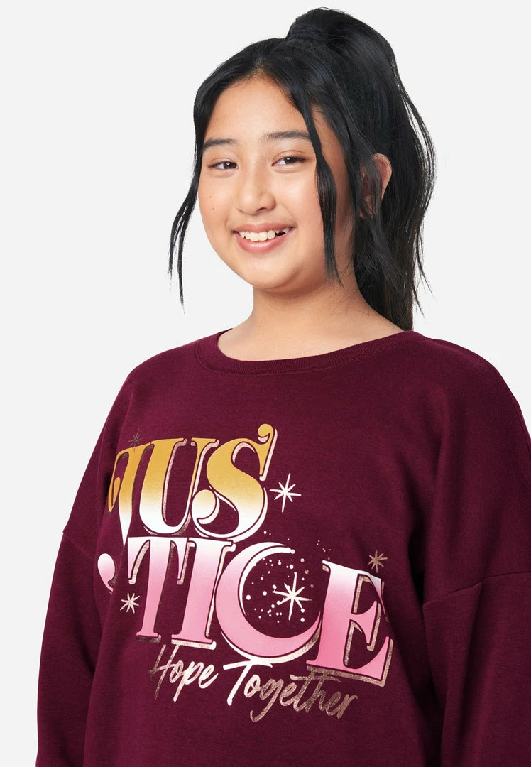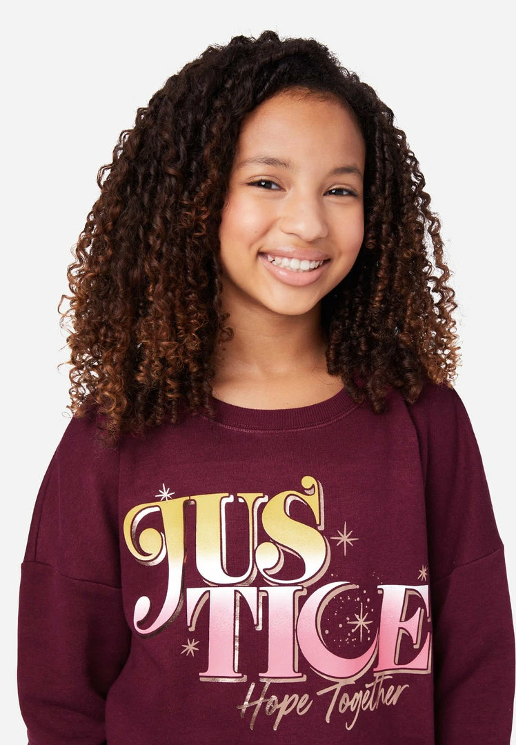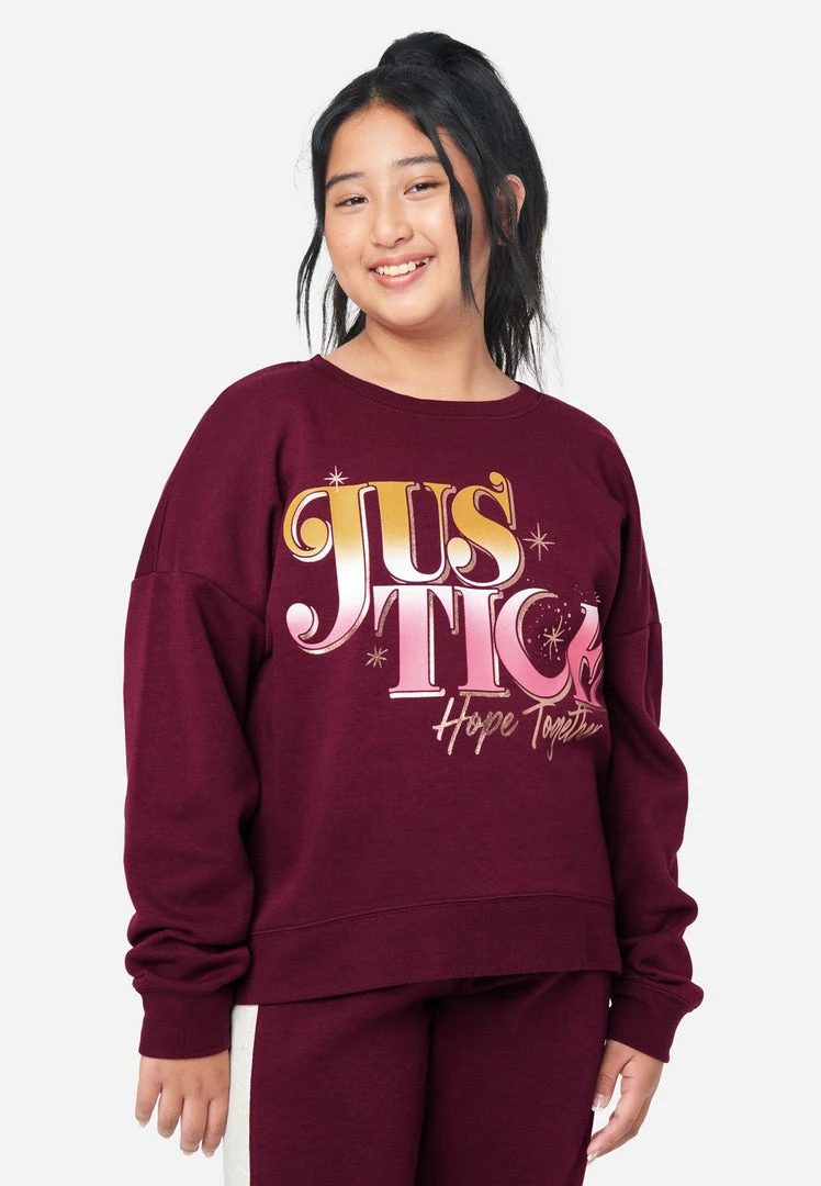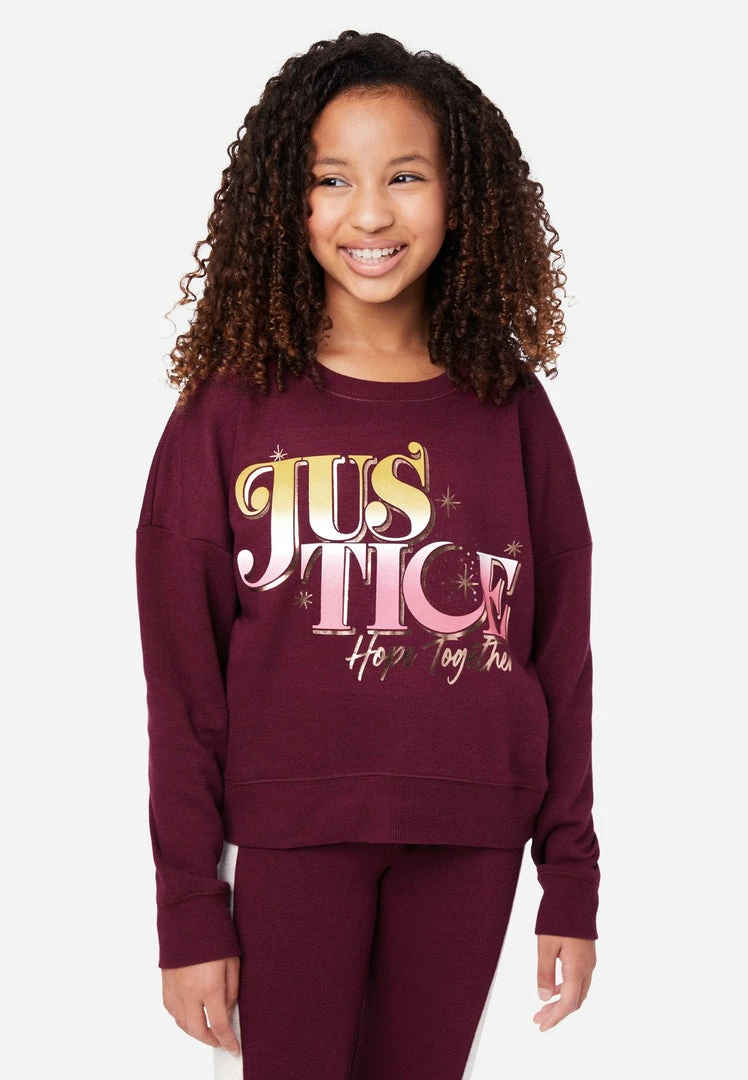 A standout graphic highlights the front of our girls’ sweatshirts. The crew neckline and dropped sleeves plus the banded cuffs and hemline bring classic style. The pullover design makes it easy to layer. And soft, cotton-blend fabric promises comfortable wear. They’re a perfect match for Justice Denim jeans. Plus, they sport playful, easy-to-pair hues that are perfect for mixing and matching with joggers in our Everyday Faves collection—which offers tons of value and is perfect for a girl who’s just discovering her own, unique personal style.Â