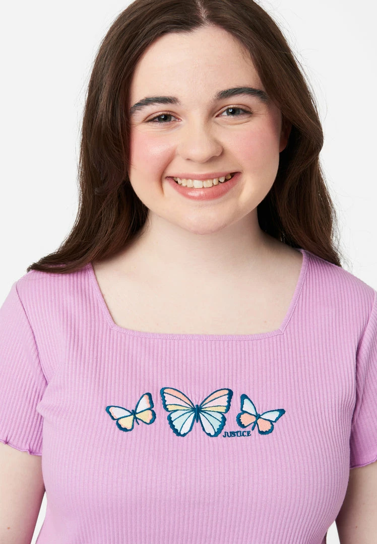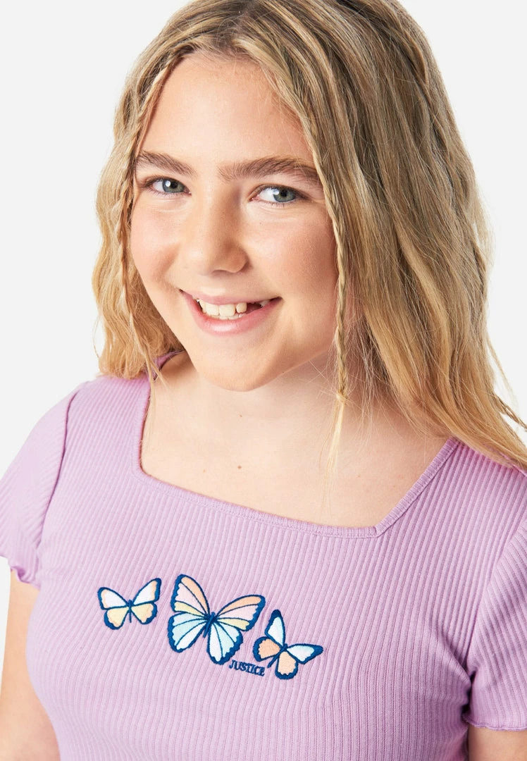 Spice up your girls’ tee game with our girls’ square-neck style. It’s made from soft and stretchy ribbed cotton that will keep your girl comfortable and cool. Wavy lettuce trim finishes the short sleeves and hemline. She’ll love pairing it with jean shorts from Justice denim shop.