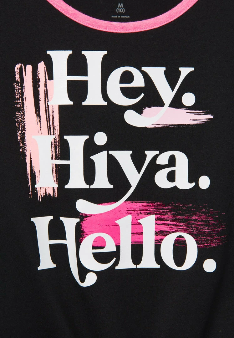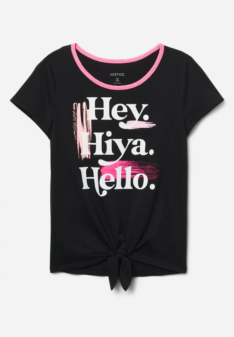 This is our take on the retro ringer style. We updated it with contrast bias binding around a scoop neckline and a tie at the front hemline. A graphic with positive sentiments adorns the front. And we designed our girls’ tees in a lightweight cotton-blend fabric that promises the comfiest wear, ever. Plus, they’re available in an array of easy-to-pair hues that are perfect for mixing and matching with leggings, shorts, and other essentials in our Everyday Faves collection—which offers tons of value and is perfect for a girl who’s just discovering her own, unique personal style.