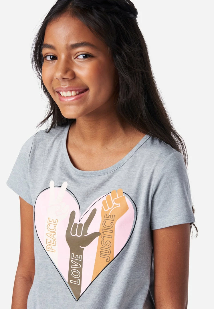 We created a line of girls’ tees for your go-getter who believes in progress and positive change. The front sports a graphic of an encouraging affirmation. Bias binding finishes the scoop neckline. A tie punctuates the front hemline. Plus, they’re designed in a lightweight cotton-blend fabric that promises the comfiest wear, ever.