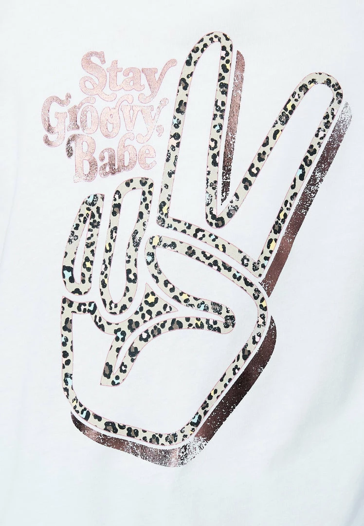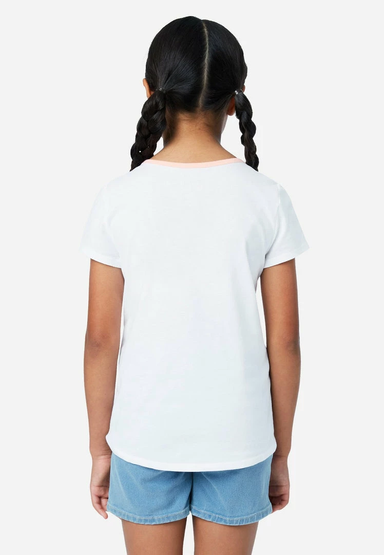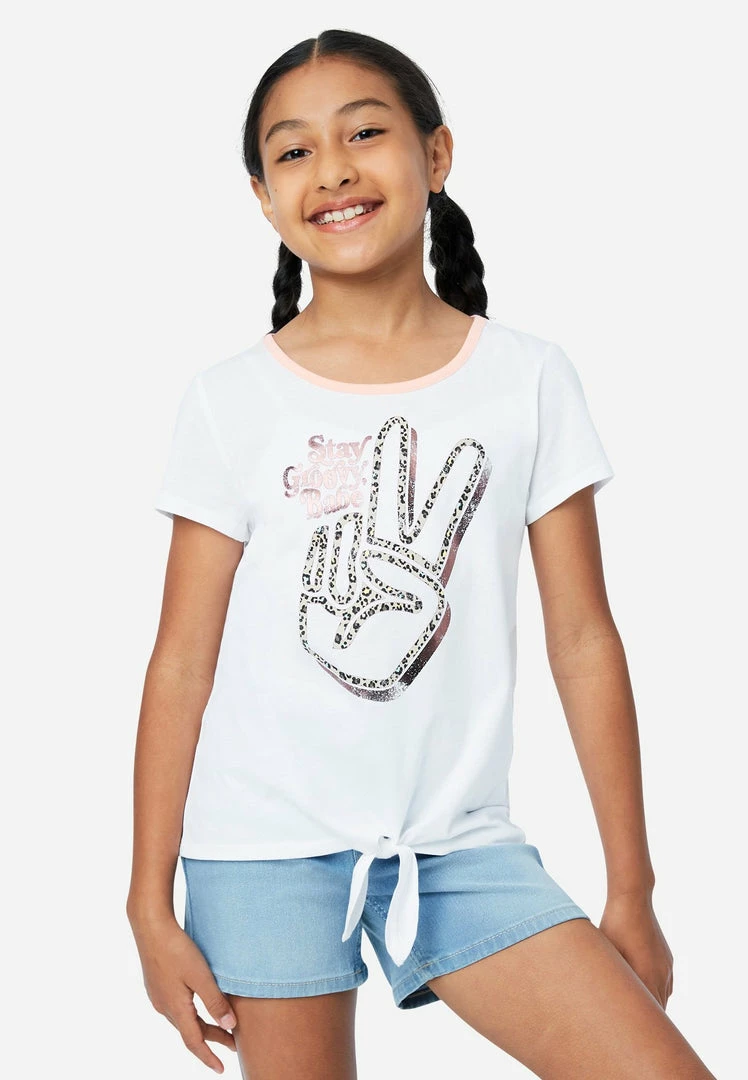 We designed our girls’ tees in a lightweight cotton-blend fabric that promises the comfiest wear, ever. They have a classic scoop neckline short sleeves. A graphic with positive sentiments adorns the front. And we updated them with a trendy tie at the front hemline. Â