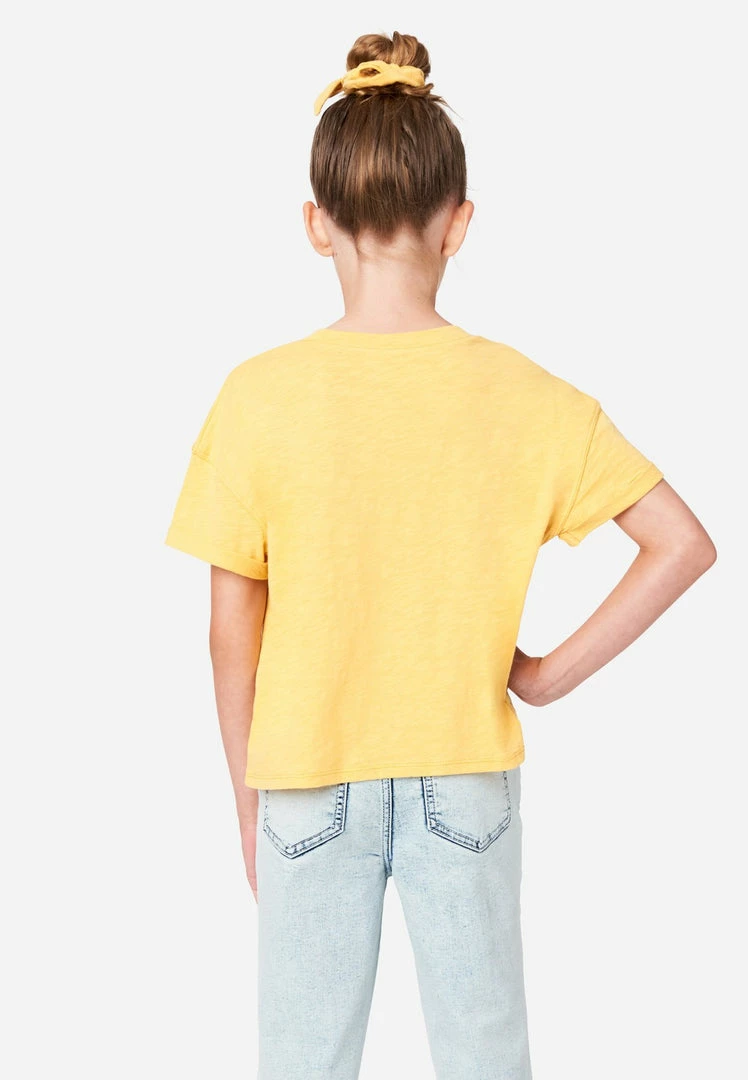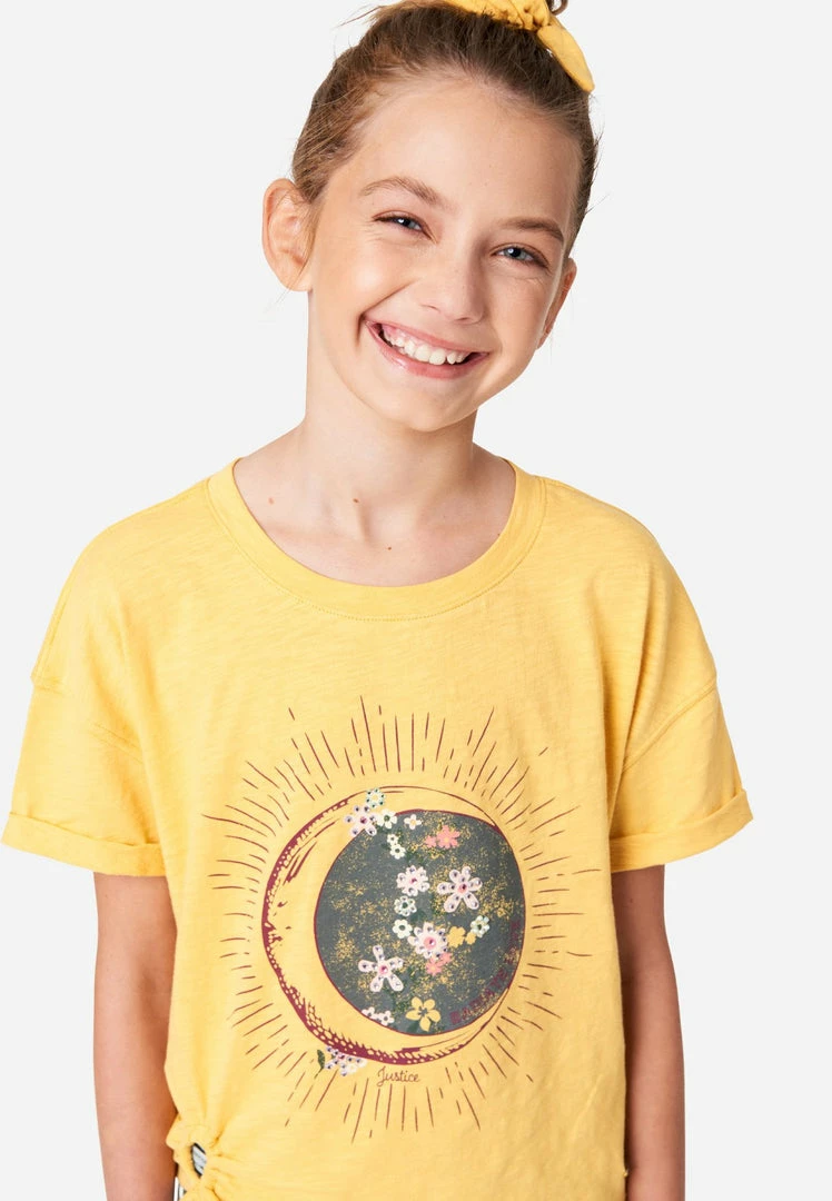 We created a line of tees for your free-spirited girl. The front has a scoop neckline, plus a graphic boasts an affirming message. Cuffs bring a pop of personality to the short dolman sleeves. A keyhole punctuates the front hemline and ties into a sweet bow. They’re designed in slub-jersey cotton that promises the comfiest wear, ever. And the matching hair tie is perfect for upgrading her updos. They pair perfectly with Justice Denim jeans.