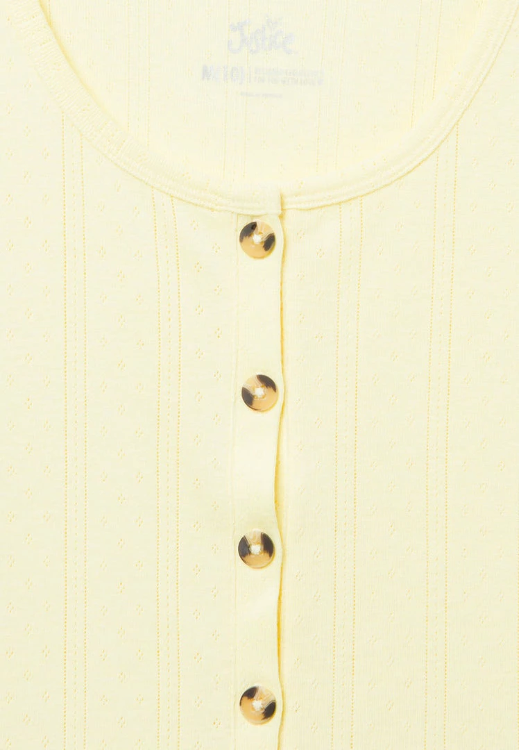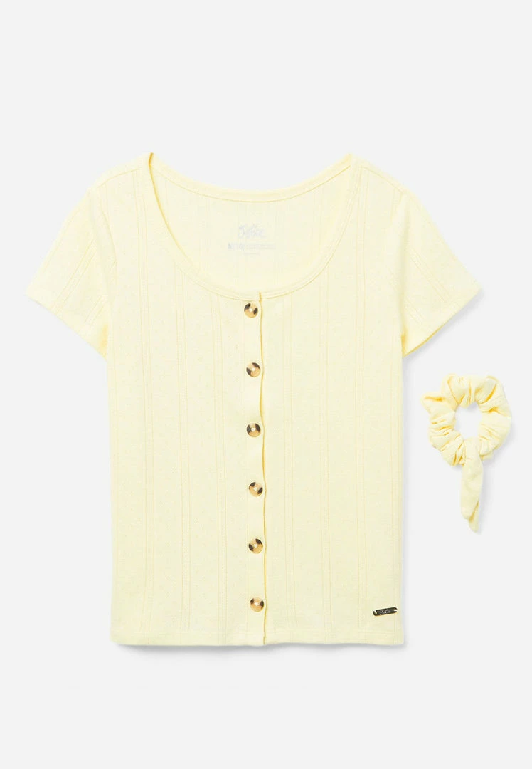 A scoop neckline, short sleeves, and solid hue offer classic style to our girls’ tops. Wood-inspired buttons add natural texture to the front. The cotton-blend fabric promises daylong comfort. Ribbing brings playful texture. And a matching hair tie is perfect for upgrading her updos.Â