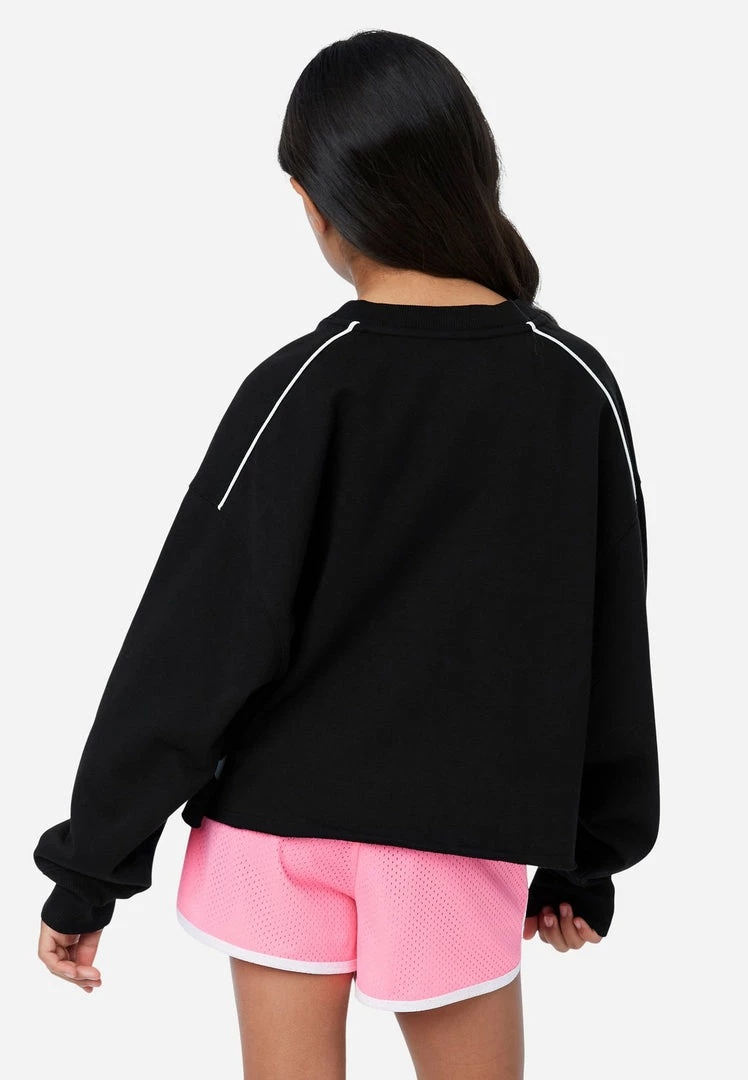 Our girls’ sweatshirts have shimmery, standout color block graphics. The crew neckline and long sleeves with banded cuffs bring classic style. The soft cotton-blend fabric promises daylong comfort. And the trendy oversized cut lends full coverage and makes them perfect for layering over leggings and other bottoms in our J Sport collection.