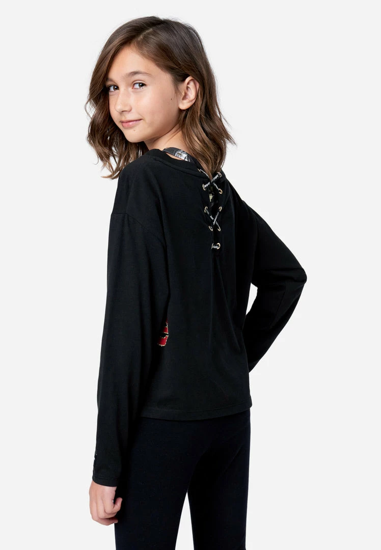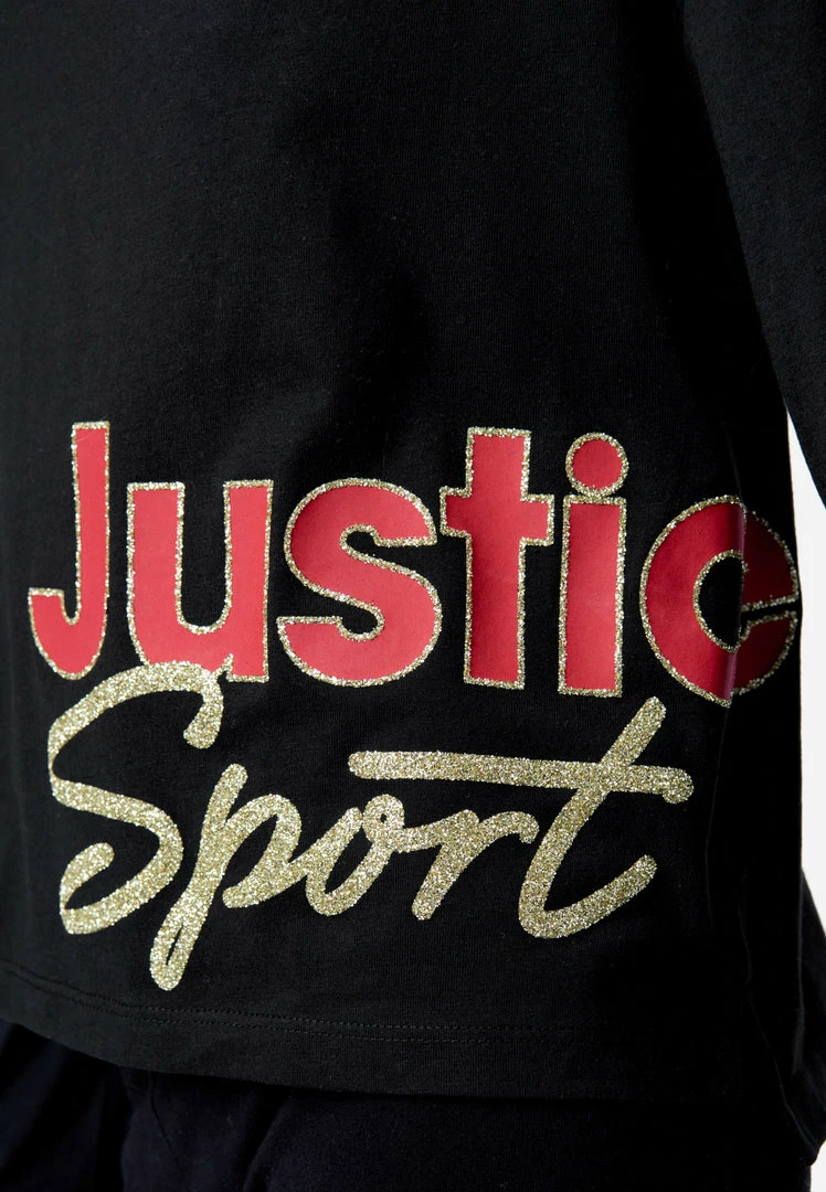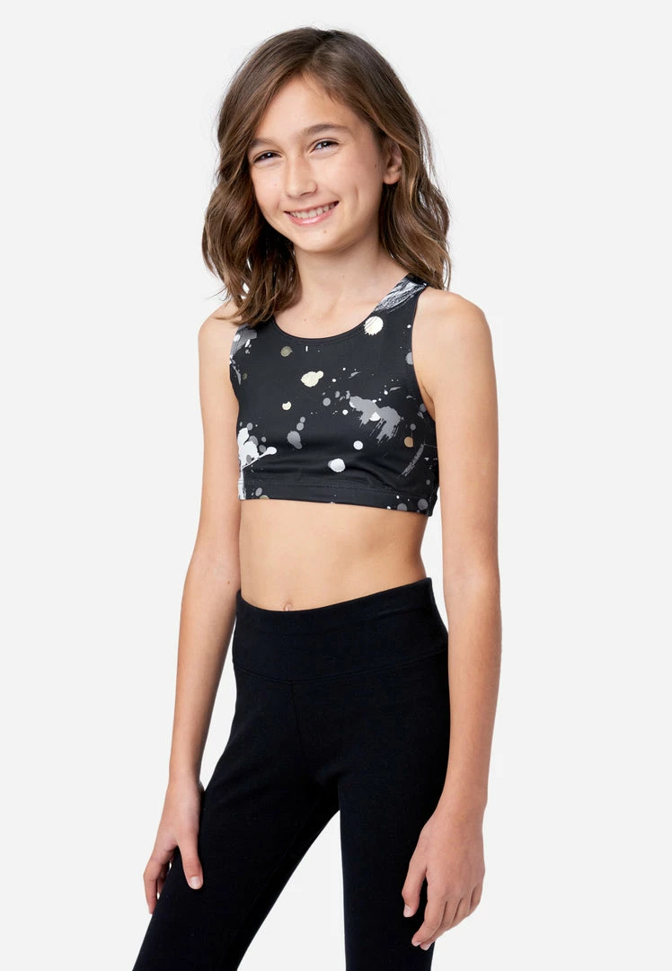 We designed our girl’s long sleeve tee with a coordinating sports bra to take the effort out of her activewear, so she can go from school to practice in no time. Bias binding finishes the scoop neckline of this layered look that’s cut from soft stretchy fabric. The sweatshirt features a bold multi-color logo graphic at the front. And the sports bra rocks a unique splattered pattern. The lace-up back shows a peak of the racerback. She’ll love styling the relaxed-cut, cropped design with leggings and other pieces from our J Sport collection.