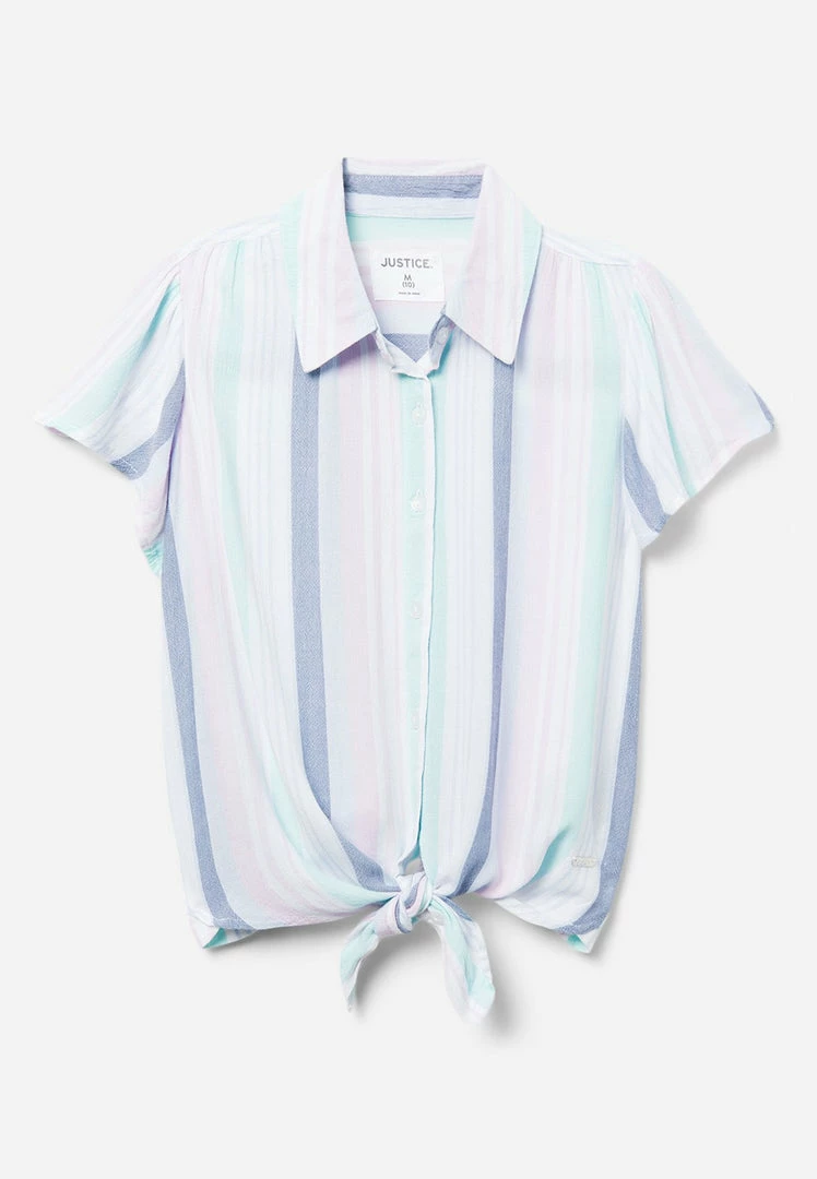 Our girls’ tops are made with lightweight, airy fabric that promises the breeziest, comfiest wear, ever. The collar and short sleeves lend classic style. A tie punctuates the front hemline. The button-up design makes them easy to pair. And a vibrant allover pattern lends standout appeal. They pair perfectly with Justice Denim shorts and jeans.