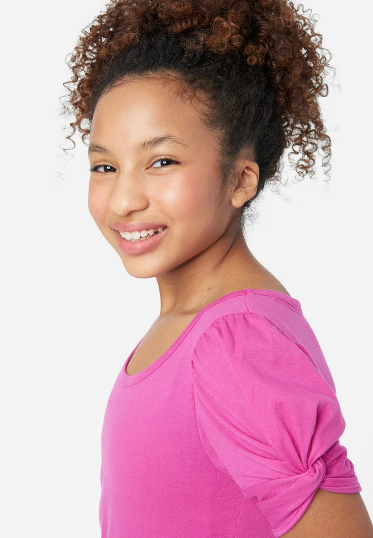 We designed our girls’ bodysuit to give your girl a sleek look. The scoop neckline is ready to be styled with her favorite necklace. Knotted puff sleeves add extra panache. And whether she wears it with jeans from the Justice denim shop or leggings from our Everyday Faves collection—which offers tons of value and is perfect for a girl who’s just discovering her own unique personal style—the bodysuit promises streamlined, fuss-free wear.