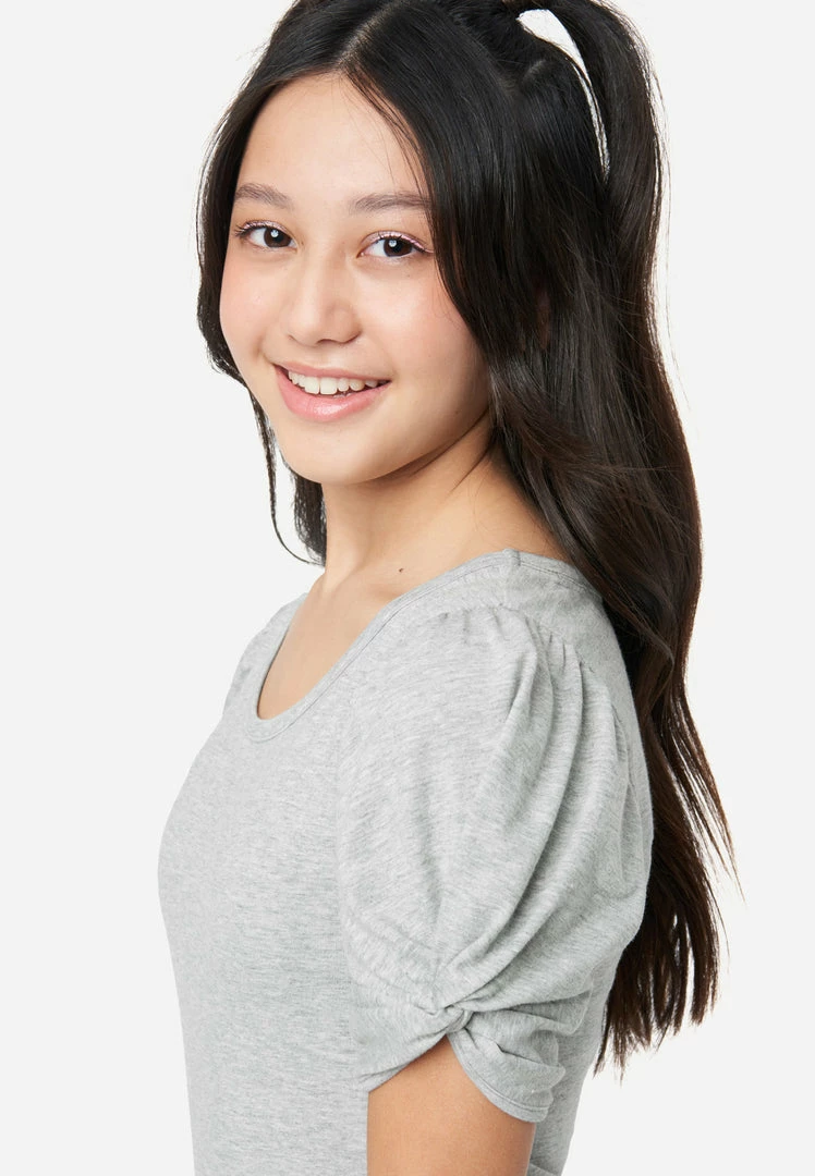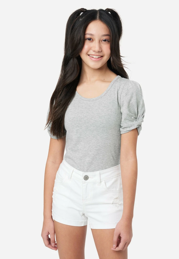 We designed our girls’ bodysuit to give your girl a sleek look. The scoop neckline is ready to be styled with her favorite necklace. Knotted puff sleeves add extra panache. And whether she wears it with jeans from the Justice denim shop or leggings from our Everyday Faves collection—which offers tons of value and is perfect for a girl who’s just discovering her own unique personal style—the bodysuit promises streamlined, fuss-free wear.