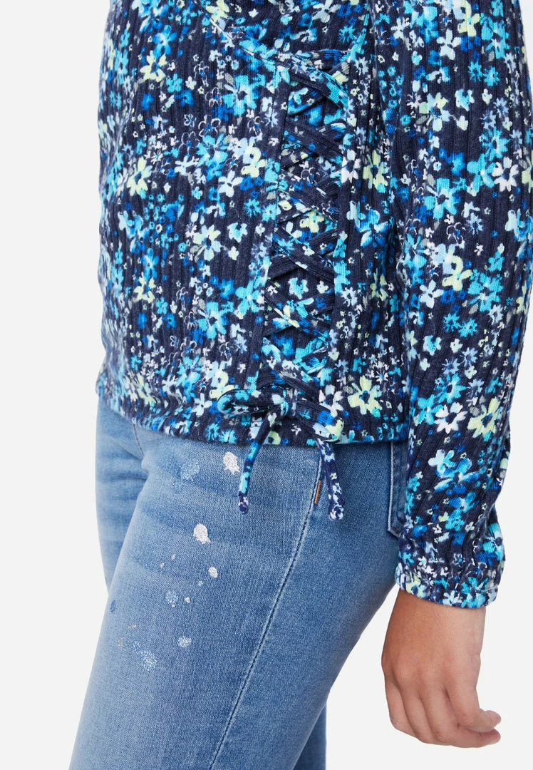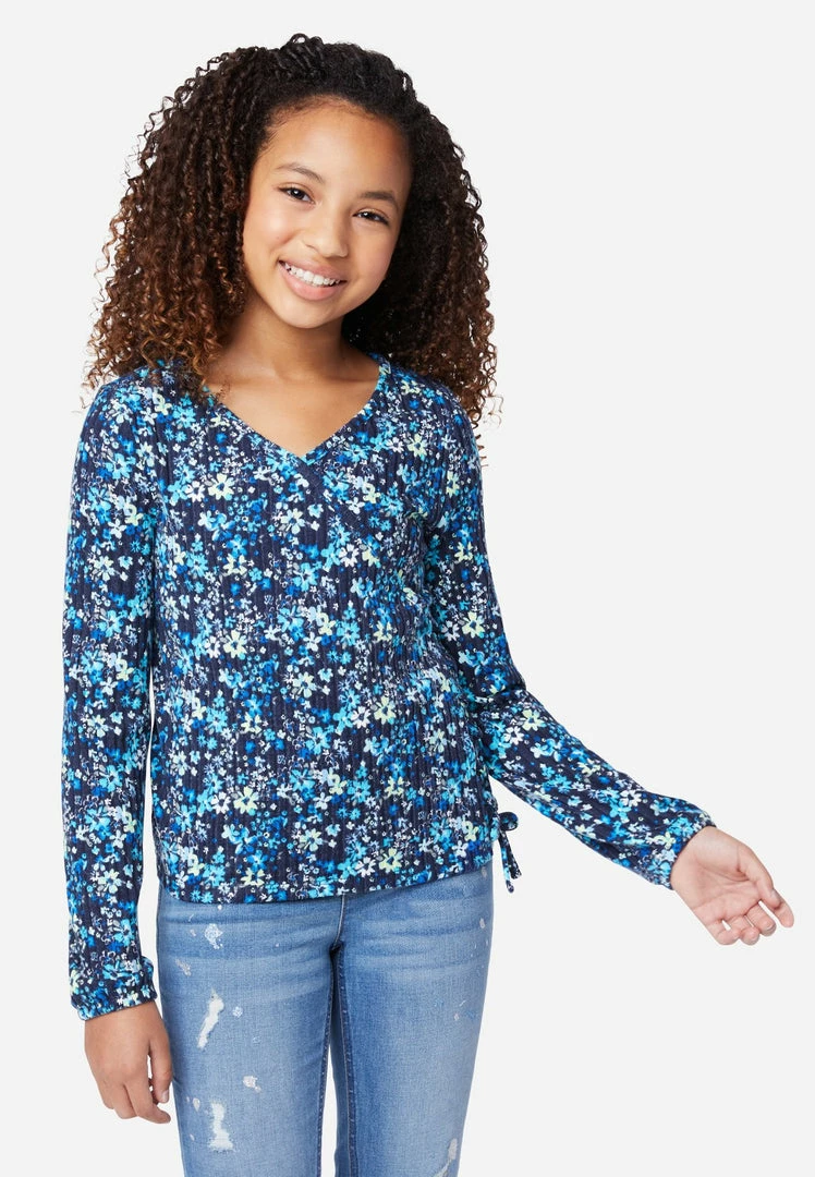 Meet her new favorite, our girls’ ribbed knit top which is crafted from soft stretch-fabric and recycled materials. This means not only will your girl look good while wearing her fashion, but she’ll feel good about her fashion, too. It’s V-neckline, that falls into a wrap-effect with a sweet side lace-up, ups the ante on her everyday style. In addition, its comfortable elastic cuffs give a slight balloon effect to its long sleeves. The easy-to-pair-hues are perfect for mixing and matching with Justice leggings or jeans from our Denim Shop.