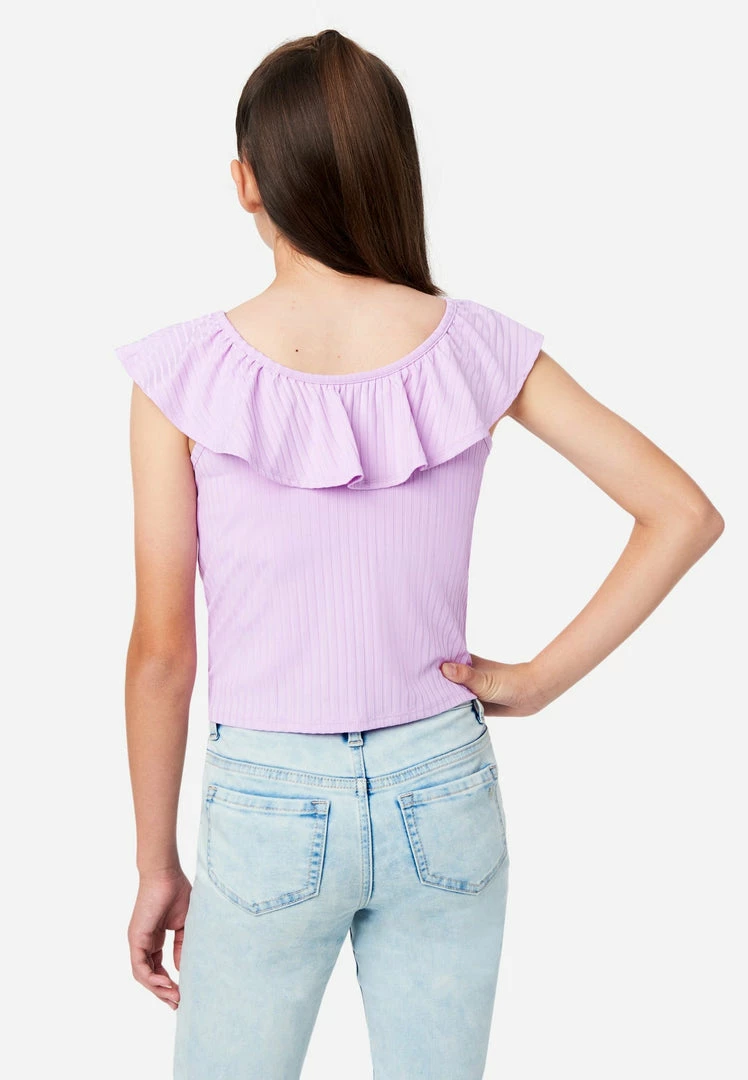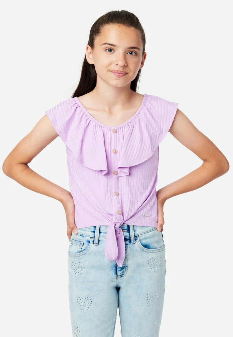 Ruffle up some compliments in this sweet-as-can-be top. The super-soft ribbed fabric lends a comfortable fit to the frilled fashion ruffle neckline style. The button front placket is completely functional, with a tie detail at the hem lending the ultimate finishing touch.