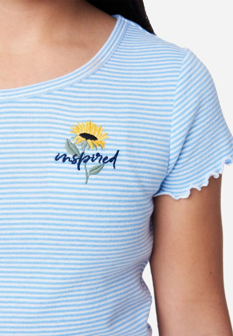 Bias binding around the scoop neckline finishes our girls’ tees. The soft, cotton-blend fabric promises comfortable wear. Wavy lettuce stitching at the hemline and cuffs brings playful texture to the tees. Sweet embroidery highlights the front. And playful pattern adds visual interest. They’re a perfect match for Justice Denim jeans.