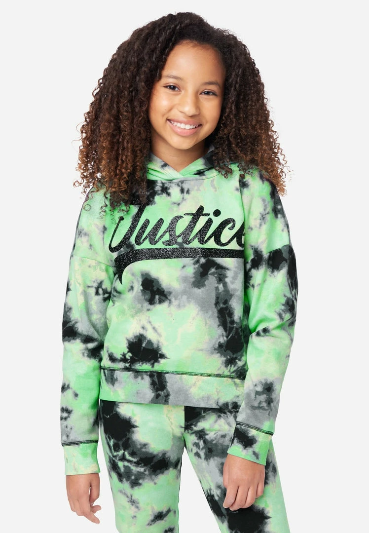 Cotton-blend fabric gives our girls’ sweatshirts a cozy finish. A tie-dye design adds a bold pop of color. A cool Justice logo highlights the front. They classic banded cuffs and hemline. The pullover design promises easy layering. Effortlessly pair them with matching joggers.