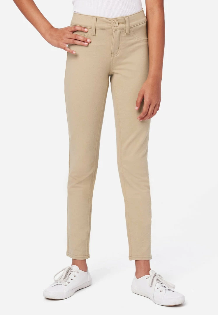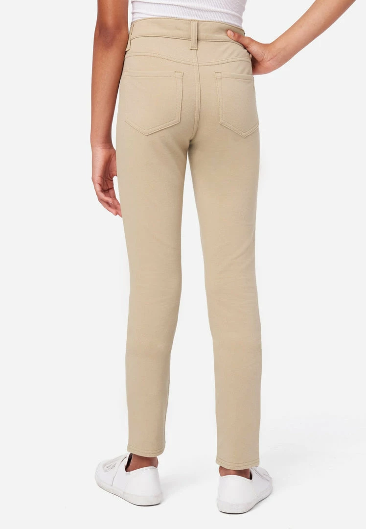 In-uniform, but on-trend! These super-soft, super-stretchy knit jeggings feature a button top and belt loops. Featuring a faux zipper and faux pockets, the streamlined style is the perfect fit, keeping her comfy all day long at school.