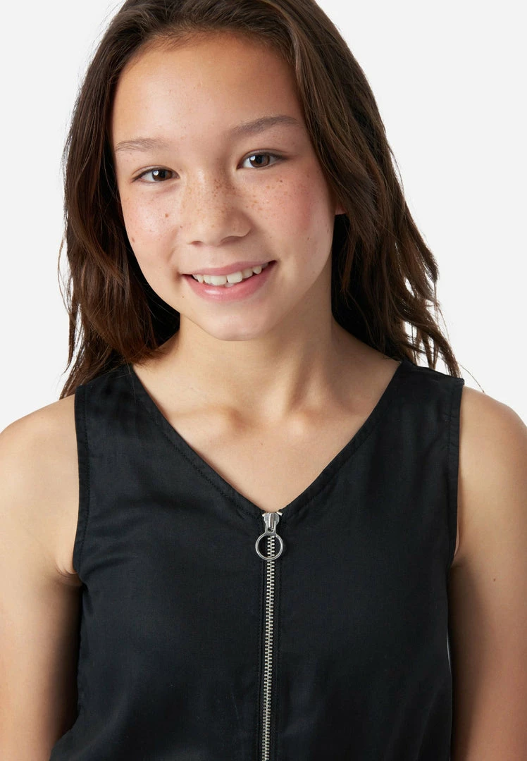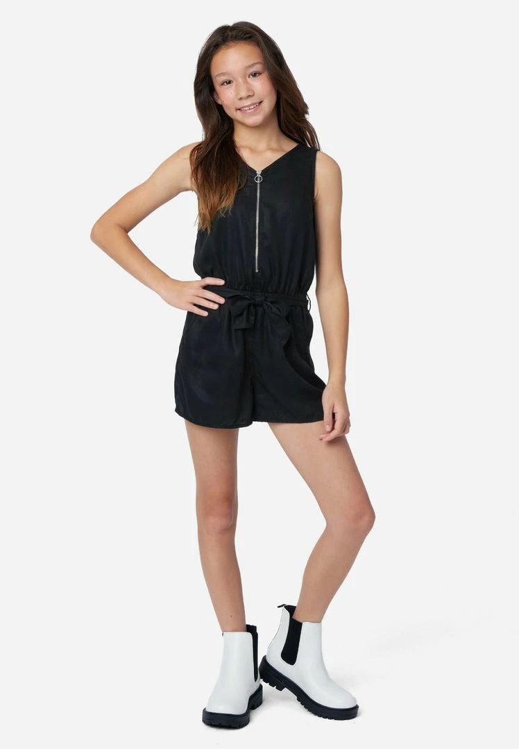 We designed our girls’ romper from lightweight, breathable fabric that’s supersoft to the touch for extra comfort. This sleeveless one-piece has a V-neckline, so your girl can stack on her favorite necklaces. A tie-waistline, with belt loops, gives it a blouson effect. And a zip-front closure keeps it secure. Add a Justice mini bag to her shoulder to complete the look.