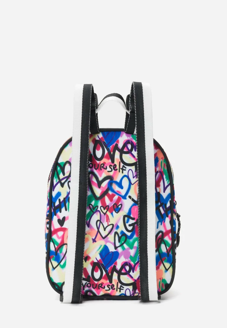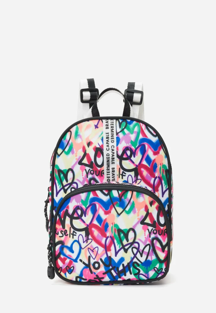 Our girls’ backpacks are just right for your on-the-go girl. A front zipper pocket keeps smaller, more important essentials organized. The larger zipper panel secures her other items. A top handle and two adjustable straps offer comfy, hands-free carrying—plus they’re color blocked for extra panache. The bold pattern gives her standout style—especially when you’re trying to spot her in the after-school crowd. Plus, a patch and logo taping boast positive sentiments to encourage her along the way.