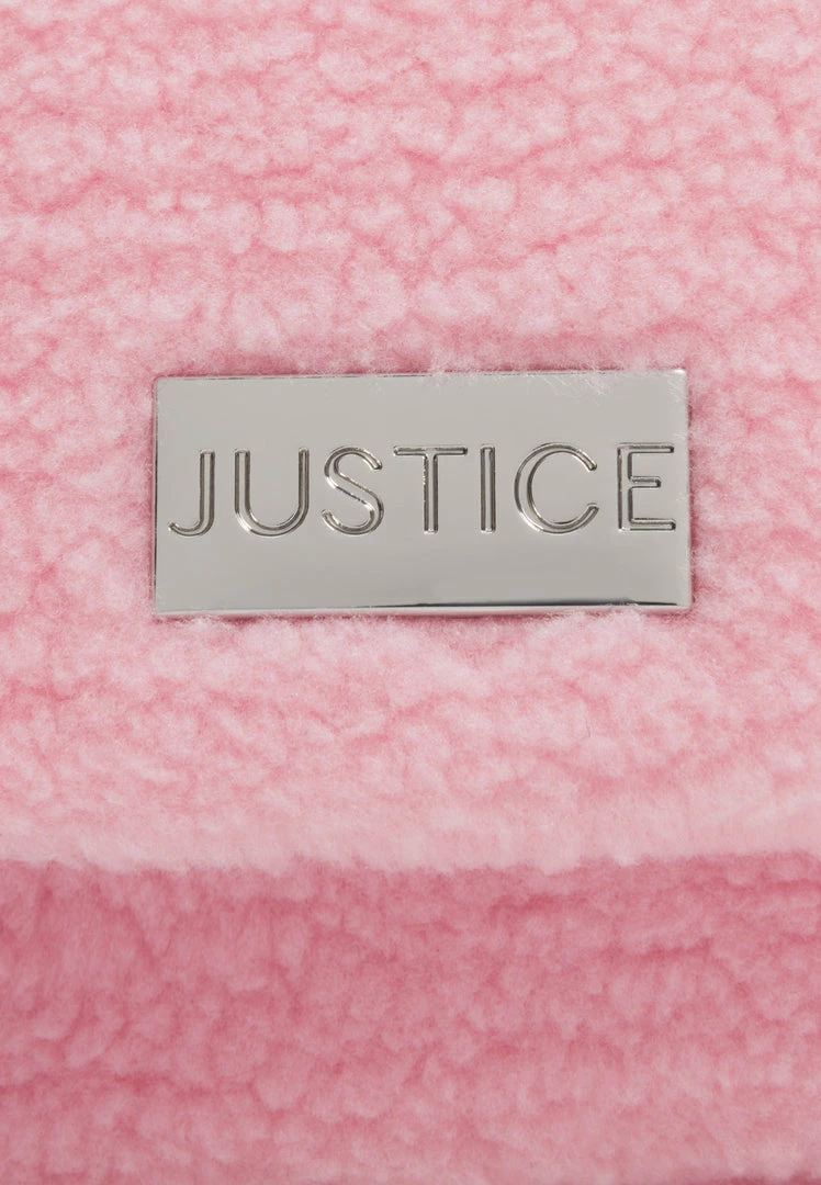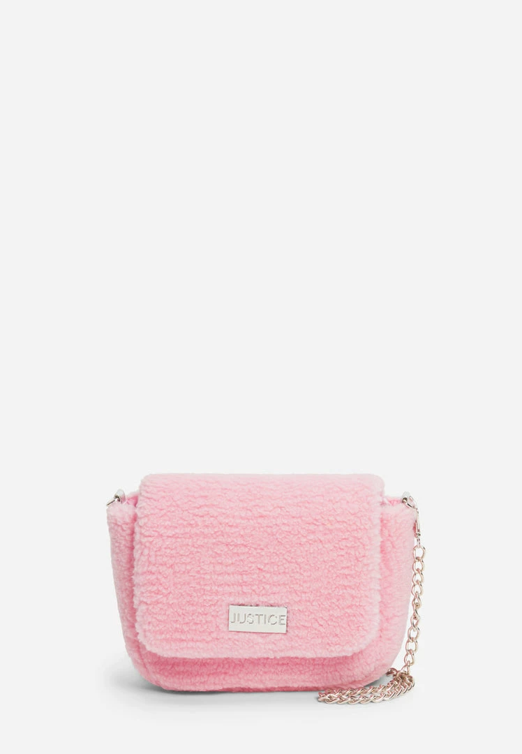 Our girls’ crossbody bag is just right for your on-the-go girl. We designed it in season-perfect faux sherpa. The front flap features a Justice logo plate. A shiny detachable crossbody chain offers hands-free carrying and a bit of glam.