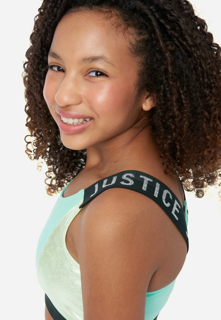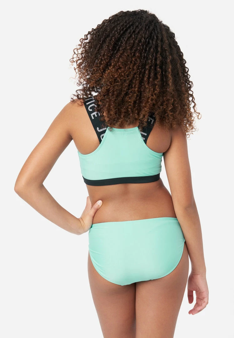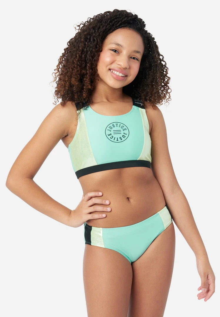 Swimming is a major sport, and with our girls’ color block bikini swim set, we keep it fashionable. The swim top has a scoop neck with shimmering side panels and wide shoulder straps—leading to a comfortable racerback. The matching mid-rise bikini bottoms have color block side panels that complete the look. The bikini swim set has all the extra special details Collection X by Justice is known for like the bold graphic and embroidered logo straps. And it’s made from recycled materials enhanced with stretch to keep this style comfy. This also means not only will your girl look good while walking on the sand, but she’ll feel good about reducing her carbon footprint, too.
