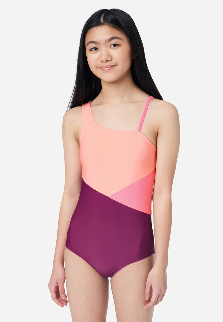 Our girls’ swimsuits sport a color-block design with bold hues that are sure to make a splash. They have two asymmetrical straps—one of which adjusts to promise a secure fit. And the super-stretchy material keeps this style comfy—plus it’s made with Repreve® polyester, which is created using recycled materials. This means not only will your girl look good while walking on the sand, but she’ll also feel good about reducing her carbon footprint, too.Â