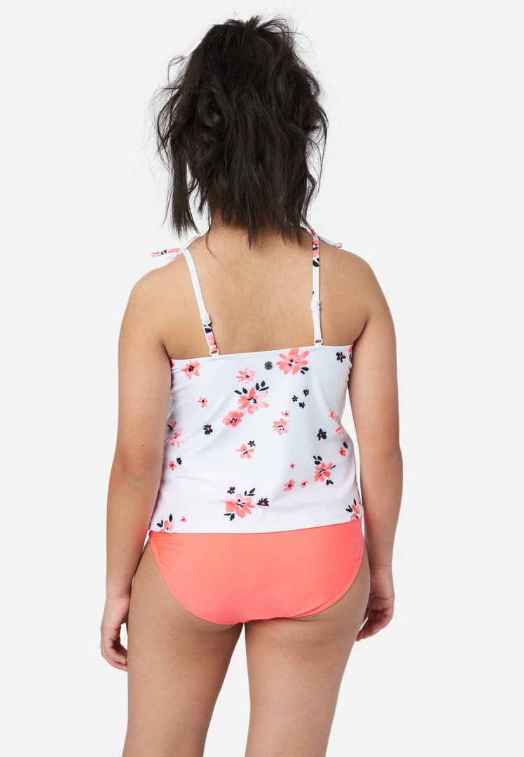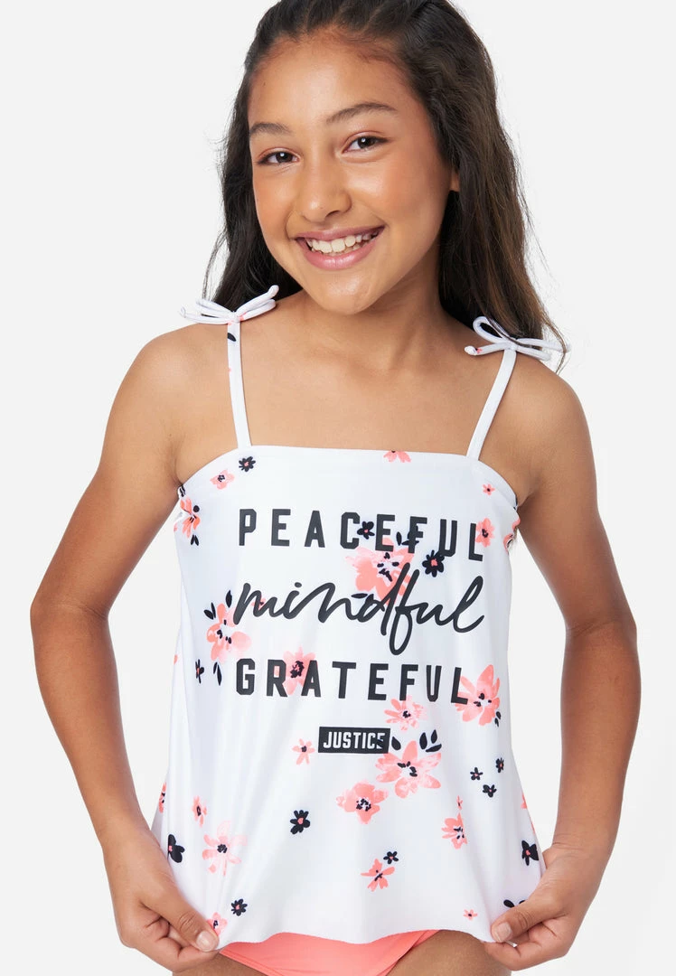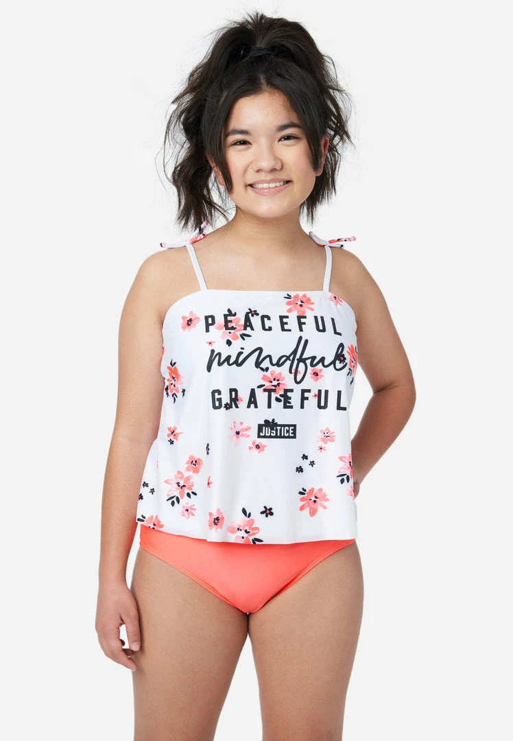 Our girls’ tankini swim sets have a swim top that sports a floral pattern and bold inspiring graphic on the front. It has a straight neckline, flounce fit, and adjustable straps for the perfect fit. The bikini bottoms have a coordinating hue that completes the look. It’s made from recycled materials, and it’s super-stretchy to keep this style comfy. This means not only will your girl look good while walking on the sand, but she’ll feel good about reducing her carbon footprint, too.