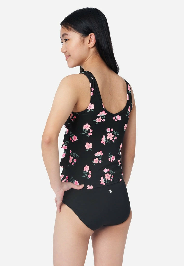 Our girls’ tankini swim sets have a swim top that sports frilly ruffles and an allover floral pattern. It has a scoop neckline, flounce fit, and two thick spaghetti straps. The matching bikini bottoms have a color-block design that completes the look. And the super-stretchy material keeps this style comfy—plus it’s made with Repreve® polyester, which is created using recycled materials. This means not only will your girl look good while walking on the sand, but she’ll also feel good about reducing her carbon footprint, too.Â
