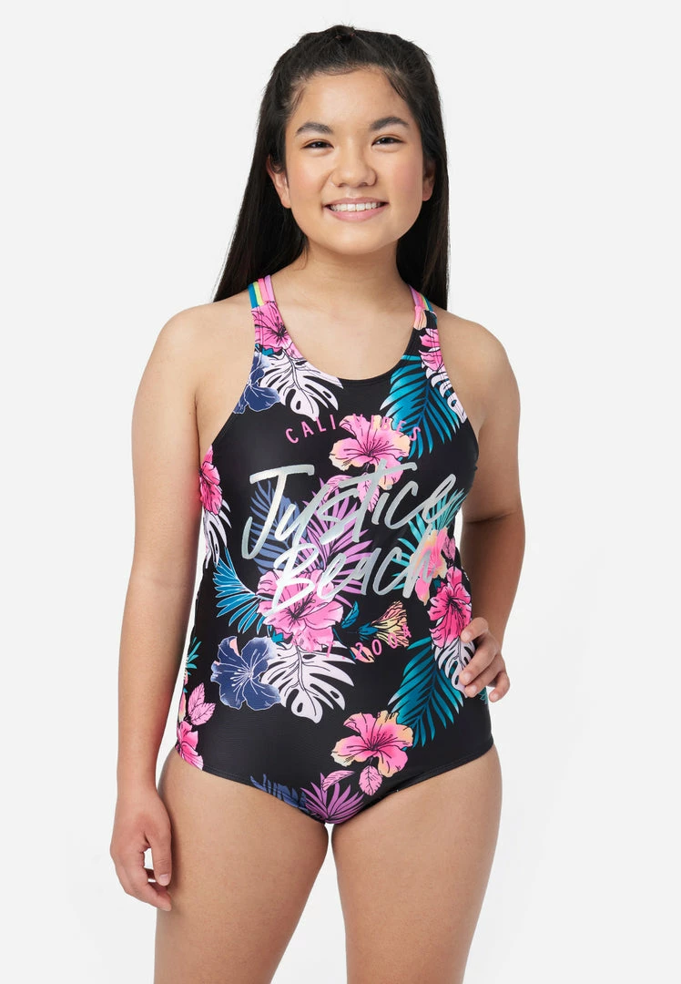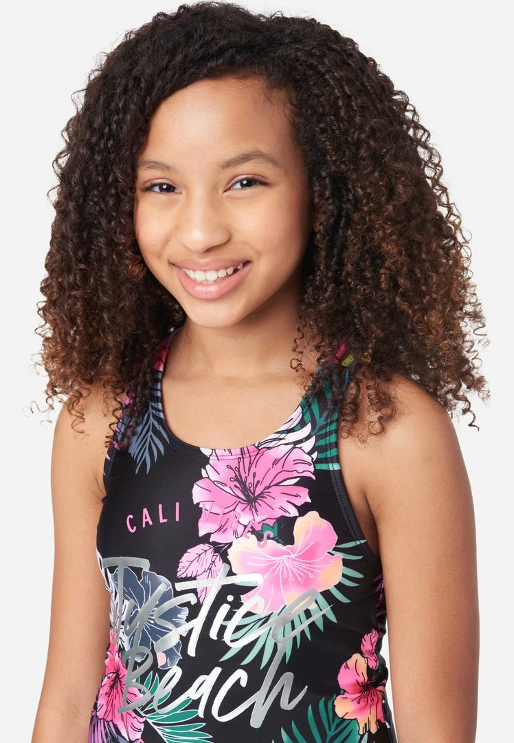 Our girls’ swimsuits sport a colorful graphic design that is sure to make a splash. They have a scoop neckline that introduces two wide multicolor racerback straps that secure the fit. They are created from recycled materials with the right amount of stretch to keep both this style comfy and the earth happy.