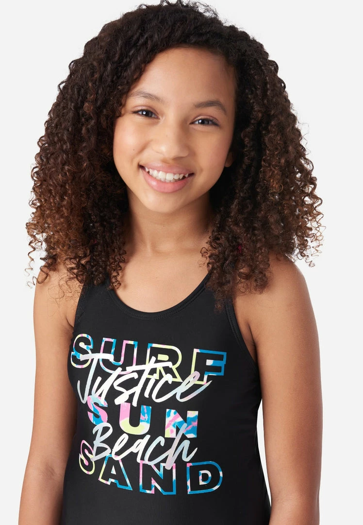 Our girls’ swimsuits sport a colorful graphic design that is sure to make a splash. They have a scoop neckline that introduces two wide multicolor racerback straps that secure the fit. They are created from recycled materials with the right amount of stretch to keep both this style comfy and the earth happy.