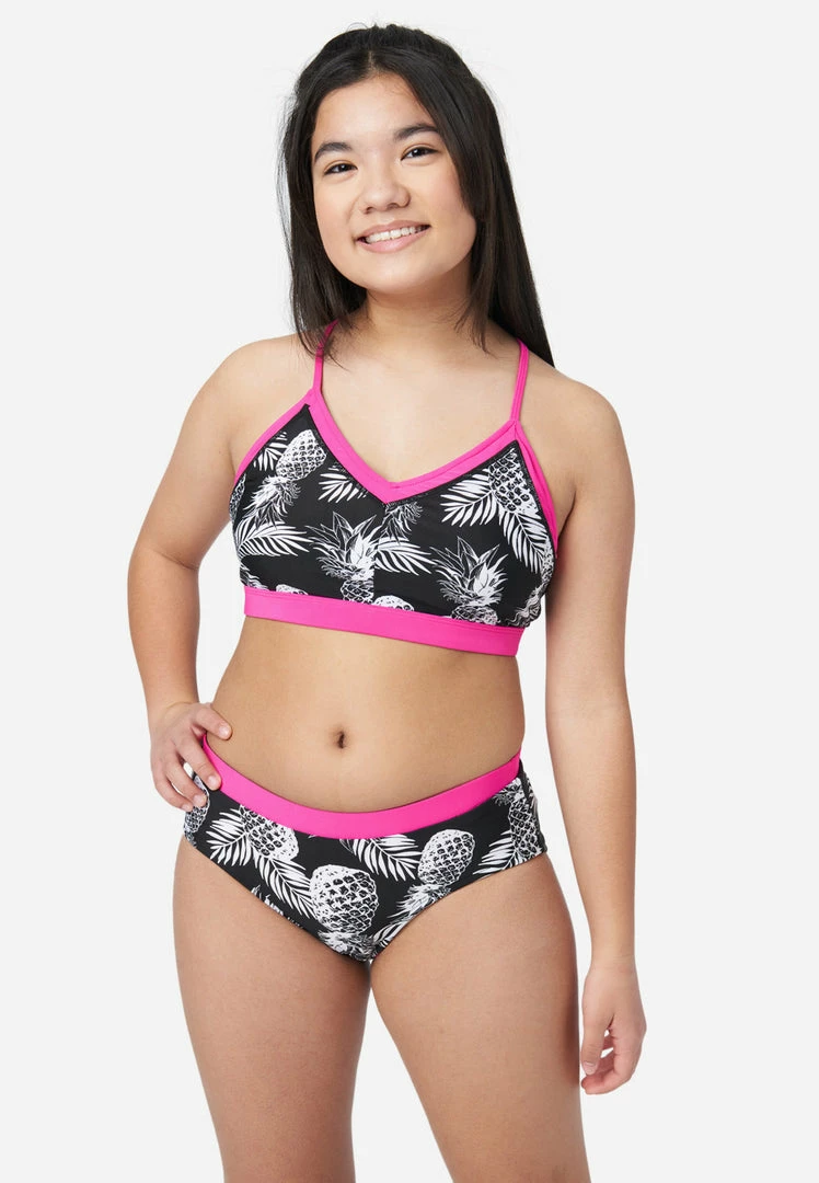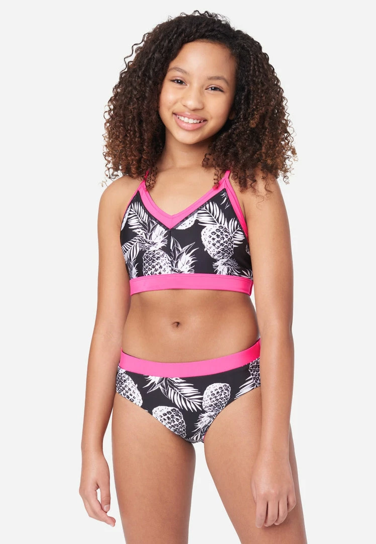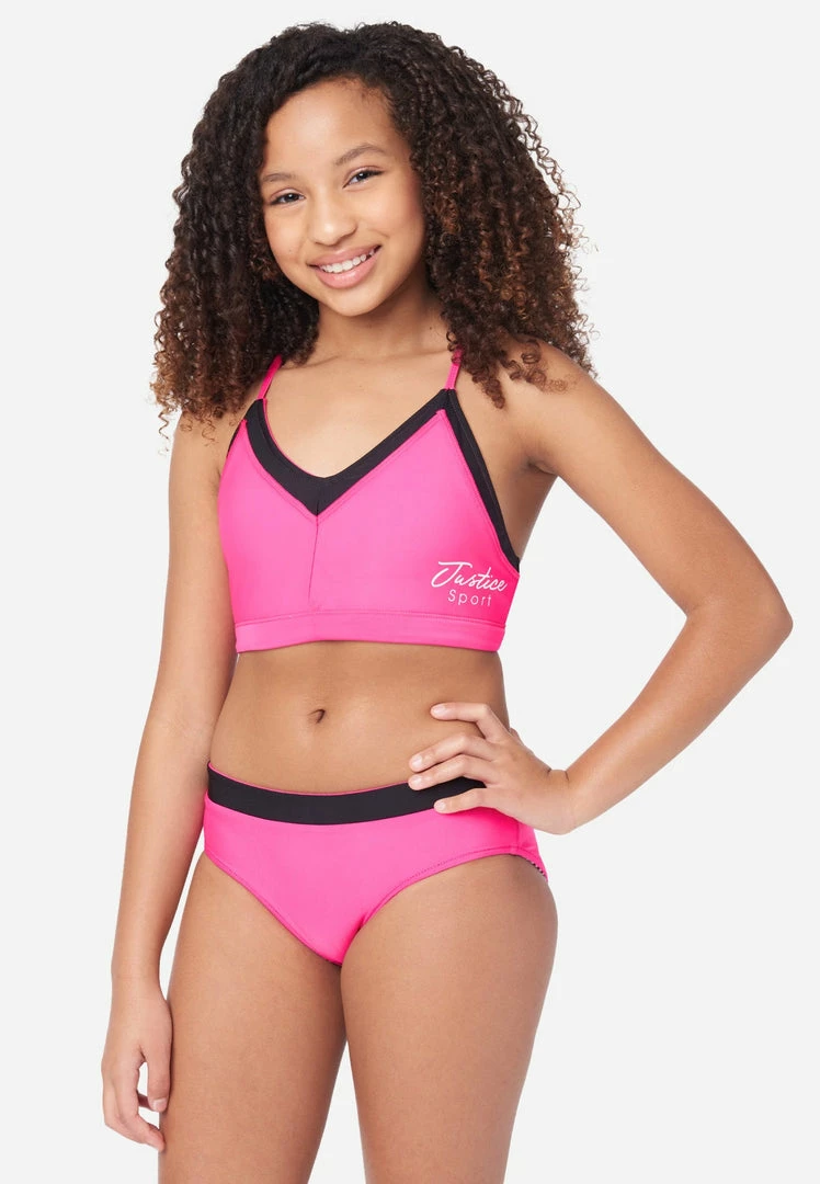 Your girl will show her crew how to effortlessly switch up a swim style in our girls’ reversible bikini swim set. The V-neckline of the color block bikini top leads to a racerback design with thin straps for a secure fit. A colorful J Sport logo graphic graces one side. The matching mid-rise bottoms have a wide waistband for maximum comfort and fuss-free wear. Your girl can flip it inside out for twice the style. And it’s made from recycled materials enhanced with stretch to keep this style comfy. This also means not only will your girl look good while walking on the sand, but she’ll feel good about reducing her carbon footprint, too.