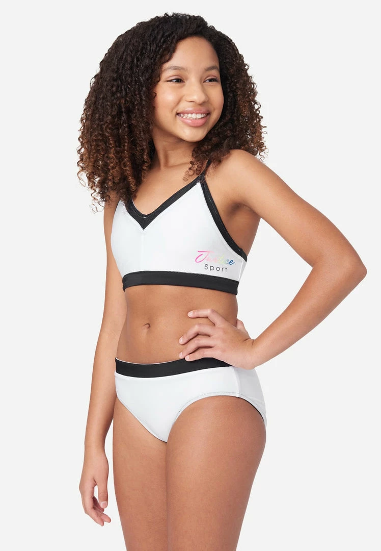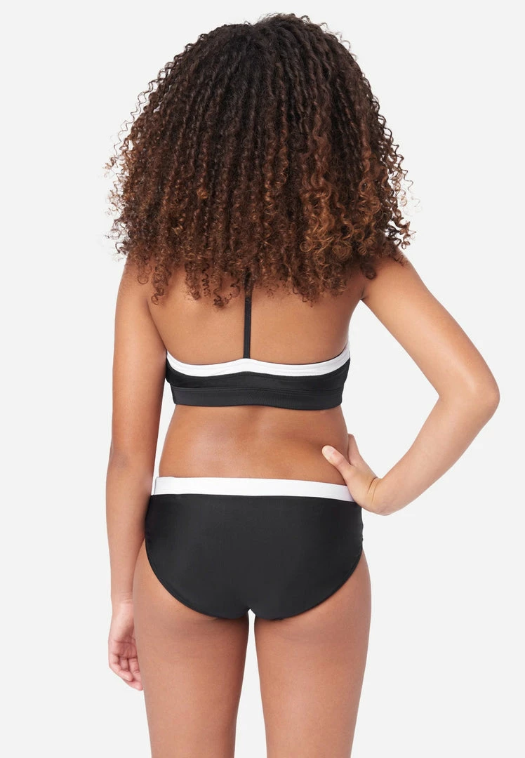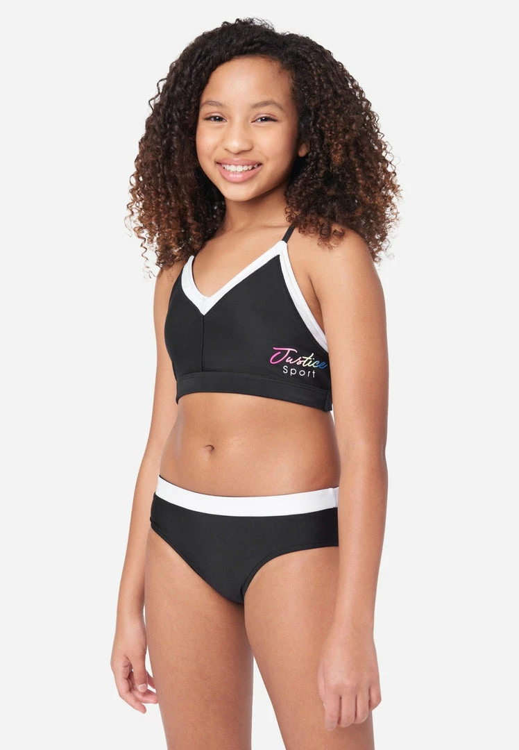 Your girl will show her crew how to effortlessly switch up a swim style in our girls’ reversible bikini swim set. The V-neckline of the color block bikini top leads to a racerback design with thin straps for a secure fit. A colorful J Sport logo graphic graces one side. The matching mid-rise bottoms have a wide waistband for maximum comfort and fuss-free wear. Your girl can flip it inside out for twice the style. And it’s made from recycled materials enhanced with stretch to keep this style comfy. This also means not only will your girl look good while walking on the sand, but she’ll feel good about reducing her carbon footprint, too.