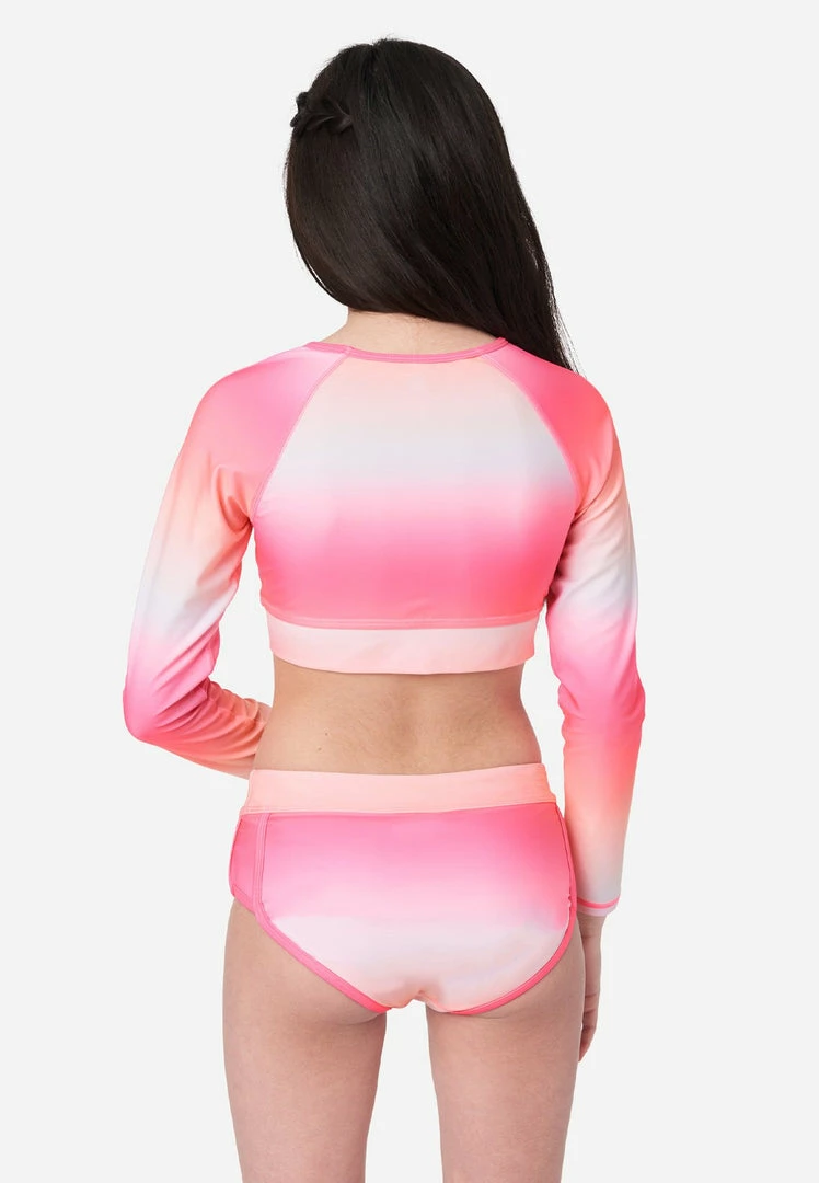Our girls’ rash guard swim sets sport a bold ombré pattern that is sure to make a splash. The swim top lends extra coverage. Bias binding finishes the neckline. A graphic highlights the front. A crisscross design brings a pop of pizzazz to the hemline. Contrast stitching polishes the armholes. And the matching bottoms have a color-block waistband, bias binding, and a boyshort cut. Plus, the super-stretchy material is made with Repreve® polyester—which is created using recycled materials. This means not only will your girl look good while walking on the sand, but she’ll also feel good about reducing her carbon footprint, too.