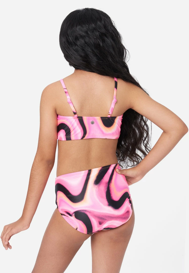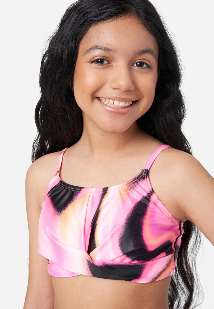 The marble pattern of our girls’ one-piece swimsuit mirrors the swirls of the waves to give your girl ocean vibes. The patterned swim top has a crewneck that leads to its wrap design and is finished with adjustable straps for a secure fit. The matching high-rise bikini bottoms have a wide wrap-style waistband to complete the look. And it’s made from recycled materials enhanced with stretch to keep this style comfy. This also means not only will your girl look good while walking on the sand, but she’ll feel good about reducing her carbon footprint, too.