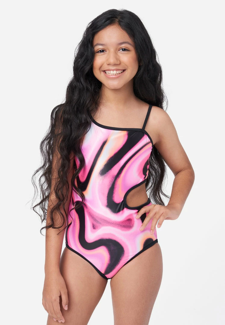 The marble pattern of our girls’ one-piece swimsuit mirrors the swirls of waves to give your girl ocean vibes. An asymmetrical design highlighted the neckline. It has a wide and thin spaghetti strap for a secure fit. The cut-out at the side gives just the right amount of trendy style. Your girl can flip it inside out for twice the style. And it’s made from recycled materials enhanced with stretch to keep this style comfy. This also means not only will your girl look good while walking on the sand, but she’ll feel good about reducing her carbon footprint, too.