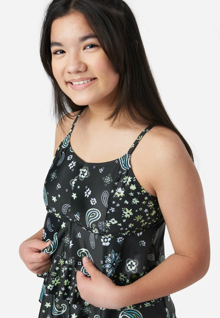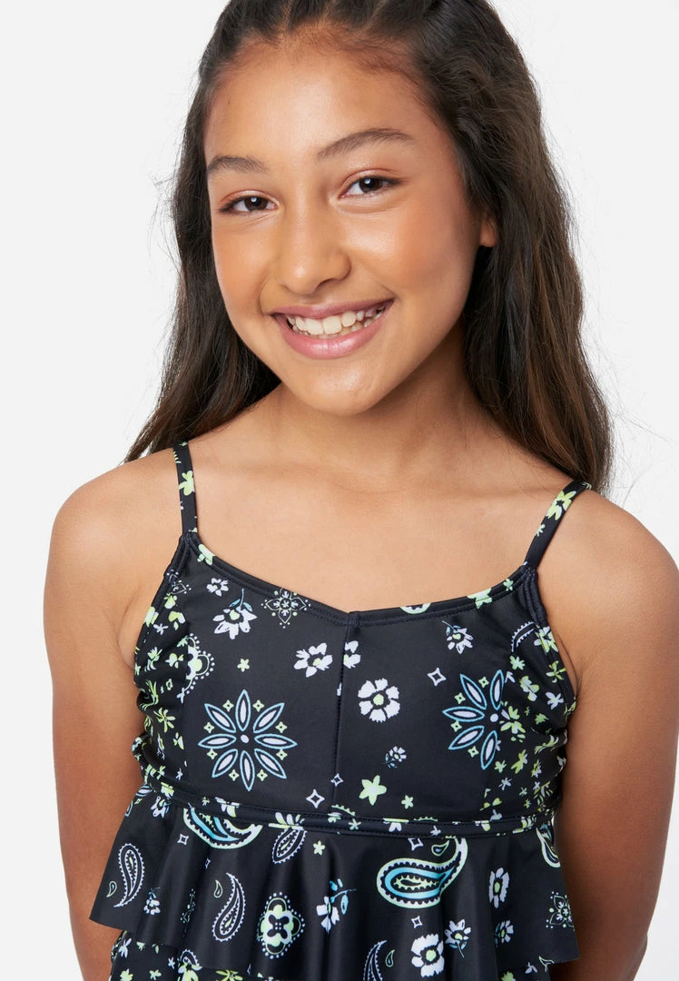 Our girls’ tankini swim sets have a swim top that sports frilly ruffles on the front and a colorful pattern. It has a soft V-neckline, flounce fit, and adjustable spaghetti straps that promise a secure fit. The coordinating bikini bottoms have a stretchy waistband that makes sure they stay put. And it’s made from recycled materials enhanced with stretch to keep this style comfy. This also means not only will your girl look good while walking on the sand, but she’ll feel good about reducing her carbon footprint, too.