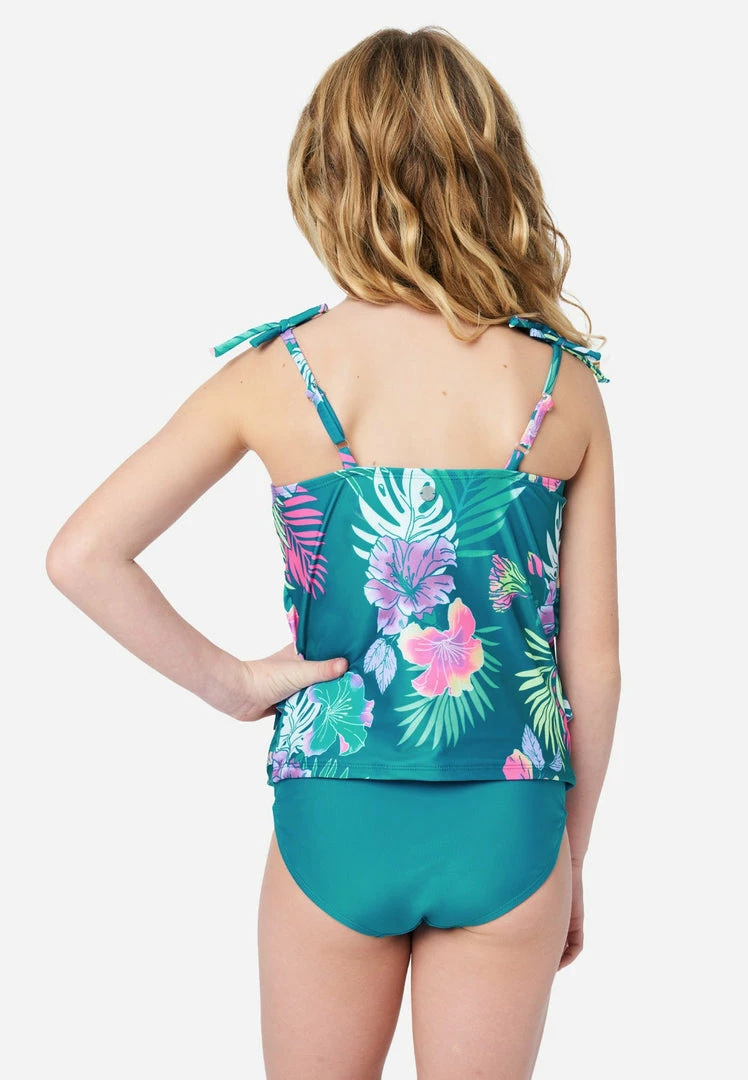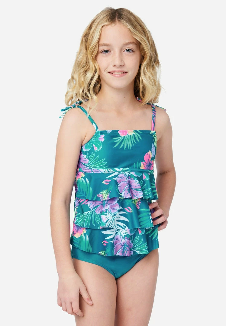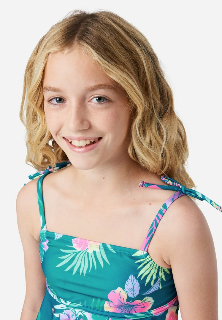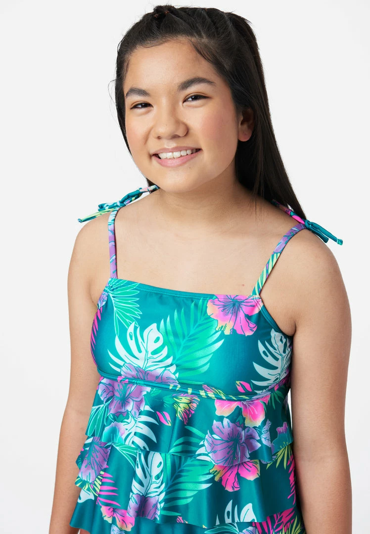 Our girls’ tankini swim sets have a swim top that sports frilly ruffles and a colorful pattern. It has a cupcake-style neckline, flounce fit, and self-tie spaghetti straps. The matching bikini bottoms complete the look and have a slim waistband—for a secure fit. Plus, they’re made from recycled fabric that’s super-stretchy to keep this style comfy. This also means not only will your girl look good while walking on the sand, but she’ll feel good about reducing her carbon footprint, too.Â