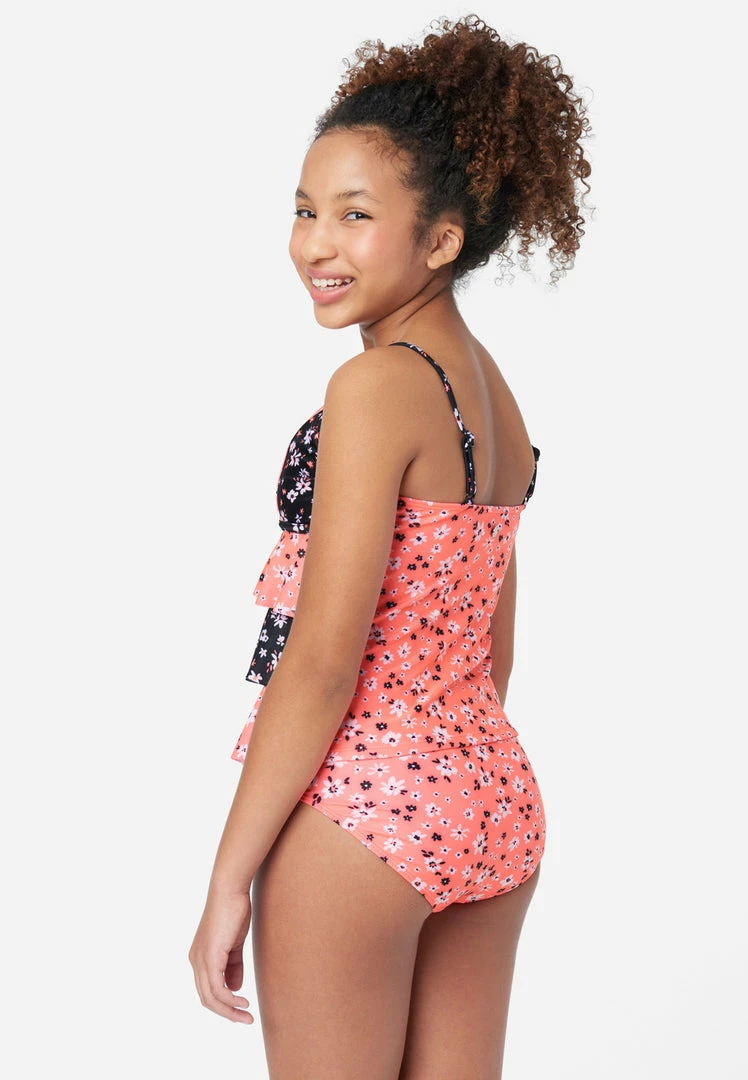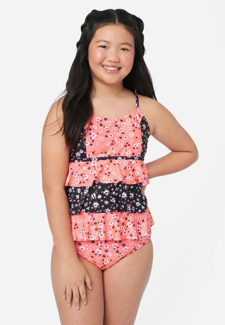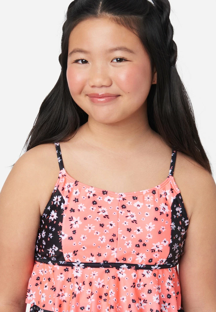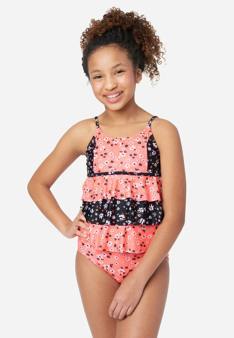 Our girls’ tankini swim sets have a swim top that sports frilly ruffles on the front and a colorful pattern. It has a soft V-neckline, flounce fit, and adjustable spaghetti straps that promise a secure fit. The coordinating bikini bottoms have a stretchy waistband that makes sure they stay put. And it’s made from recycled materials enhanced with stretch to keep this style comfy. This also means not only will your girl look good while walking on the sand, but she’ll feel good about reducing her carbon footprint, too.Â