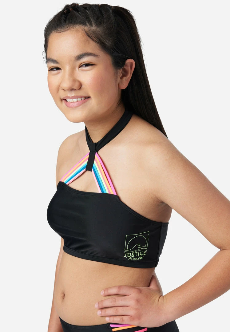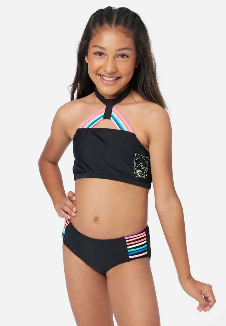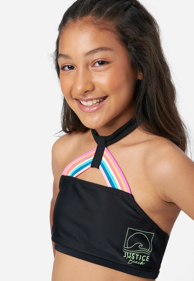 Your girl’s swim look will pop in our girls’ bikini swim sets boasting vibrant rainbow straps that highlight the halter neckline. The matching mid-rise bikini bottoms are accented with rainbow straps at the sides to complete the look. And it’s made from recycled materials enhanced with stretch to keep this style comfy. This also means not only will your girl look good while walking on the sand, but she’ll feel good about reducing her carbon footprint, too.